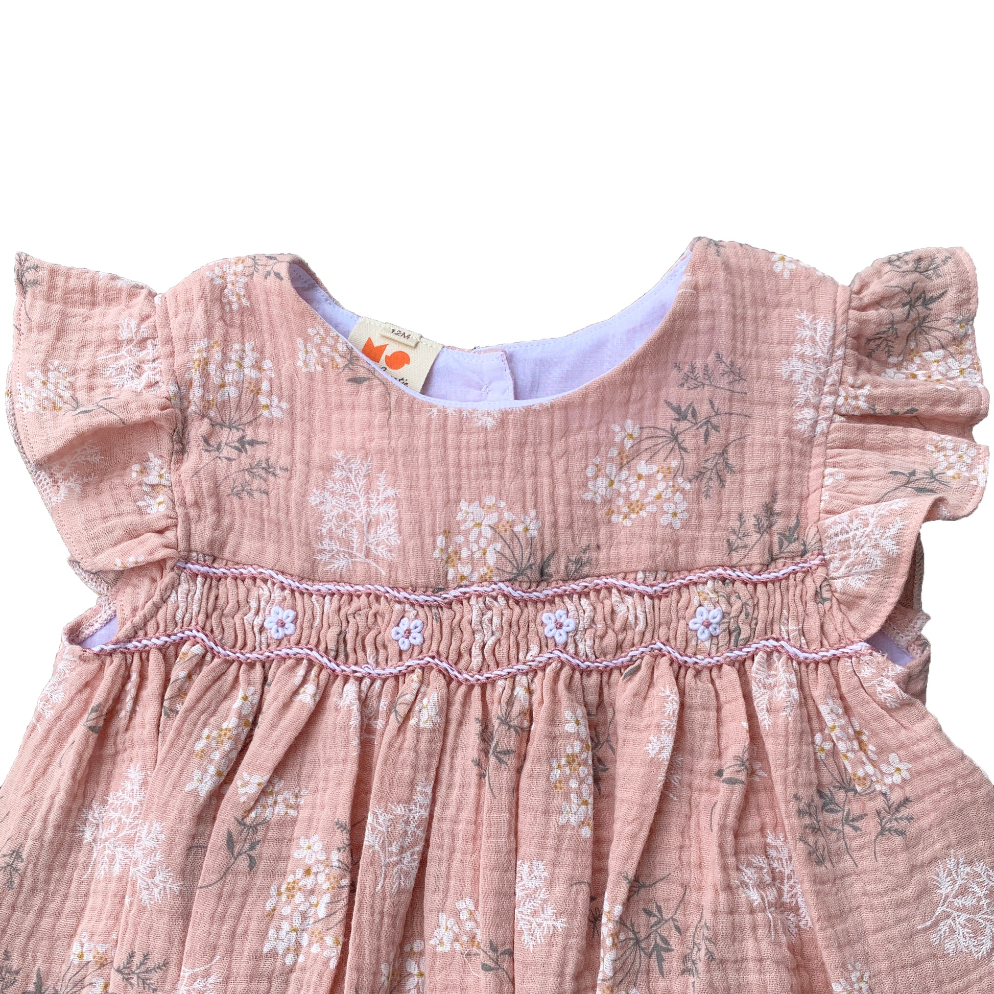 This lovely smocked romper is made from high quality cotton, textured fabric with delicate hand smocked and embroidery. It is light, comfy and perfect for baby activities.