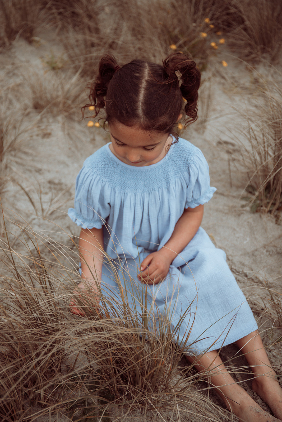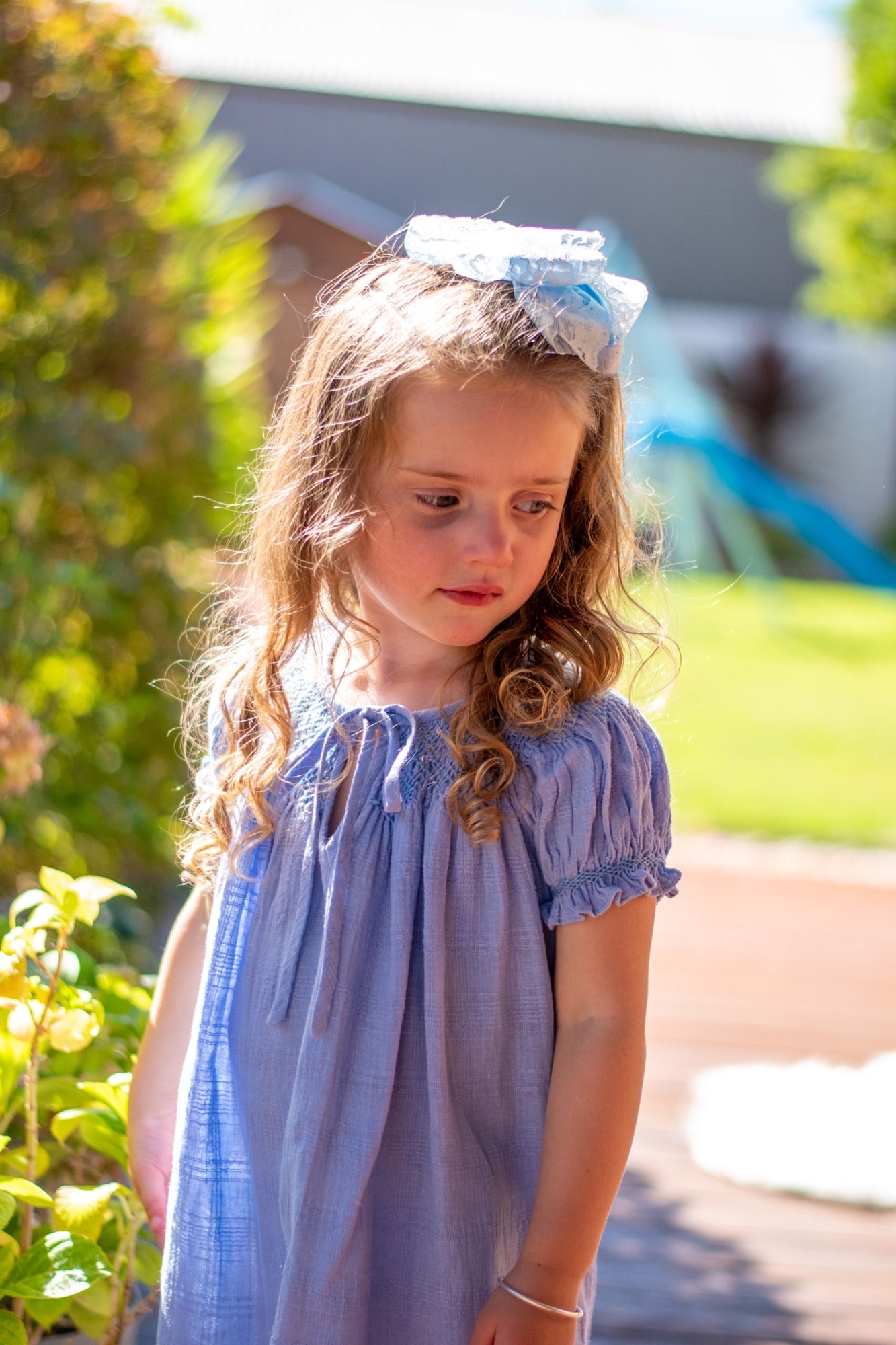 This lovely bishop dress is made from 100% soft cotton blue fabric. It has intricate hand smocking across the chest. Perfect for everyday wear.