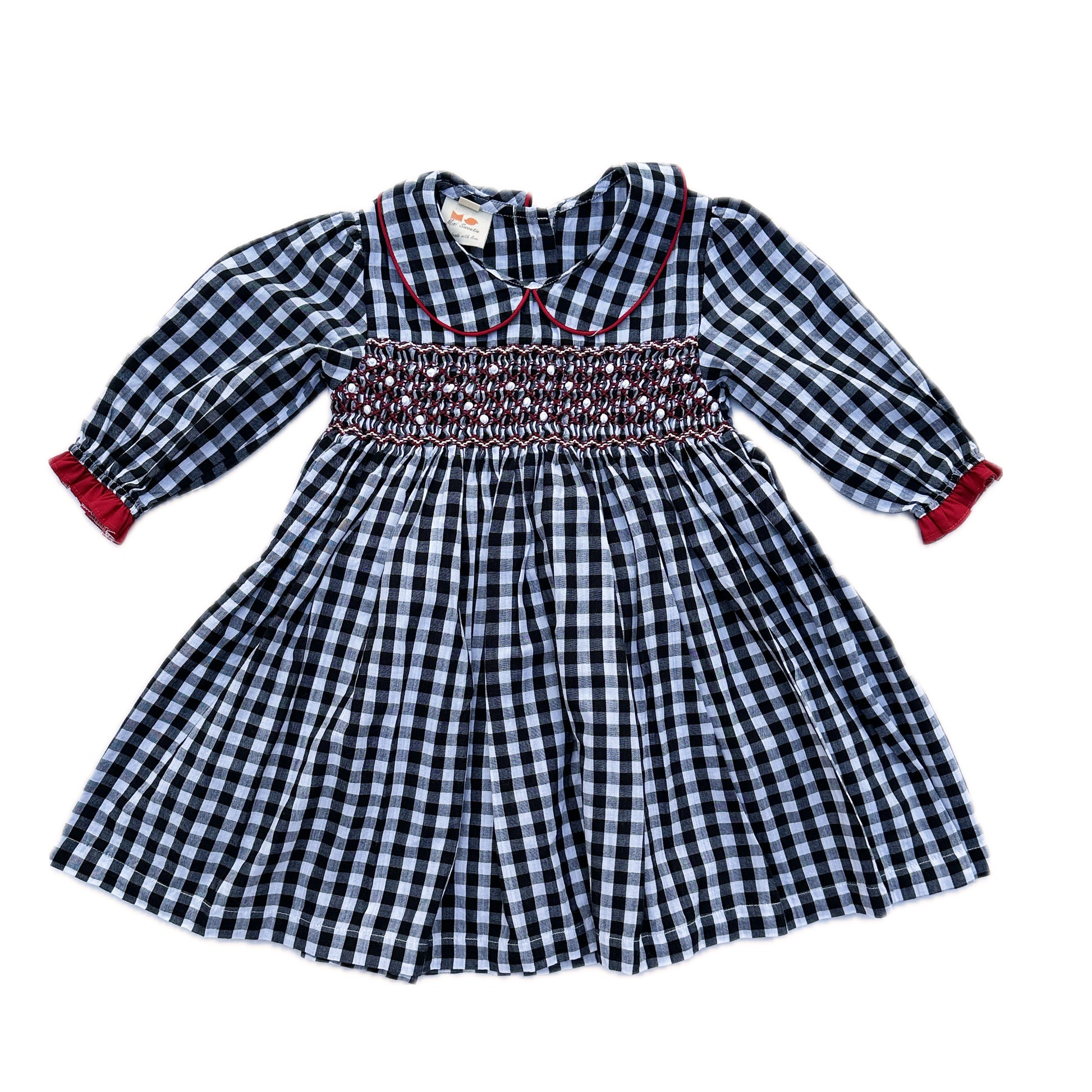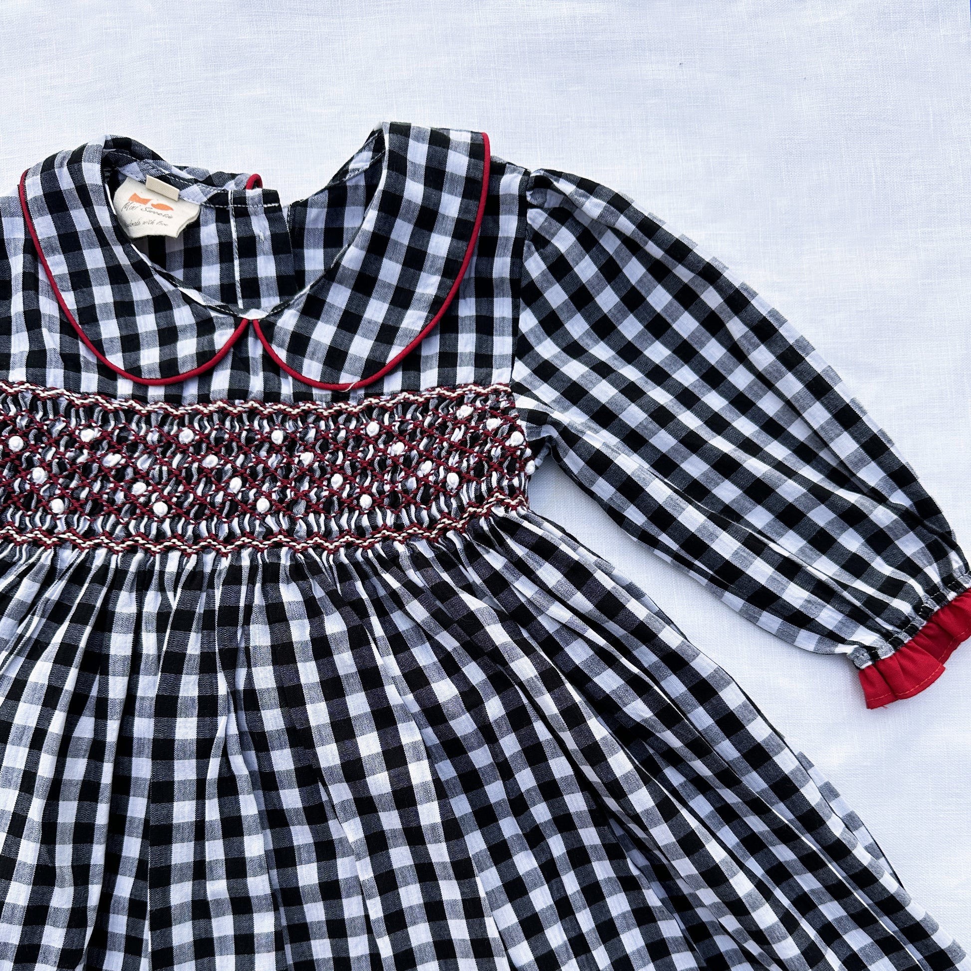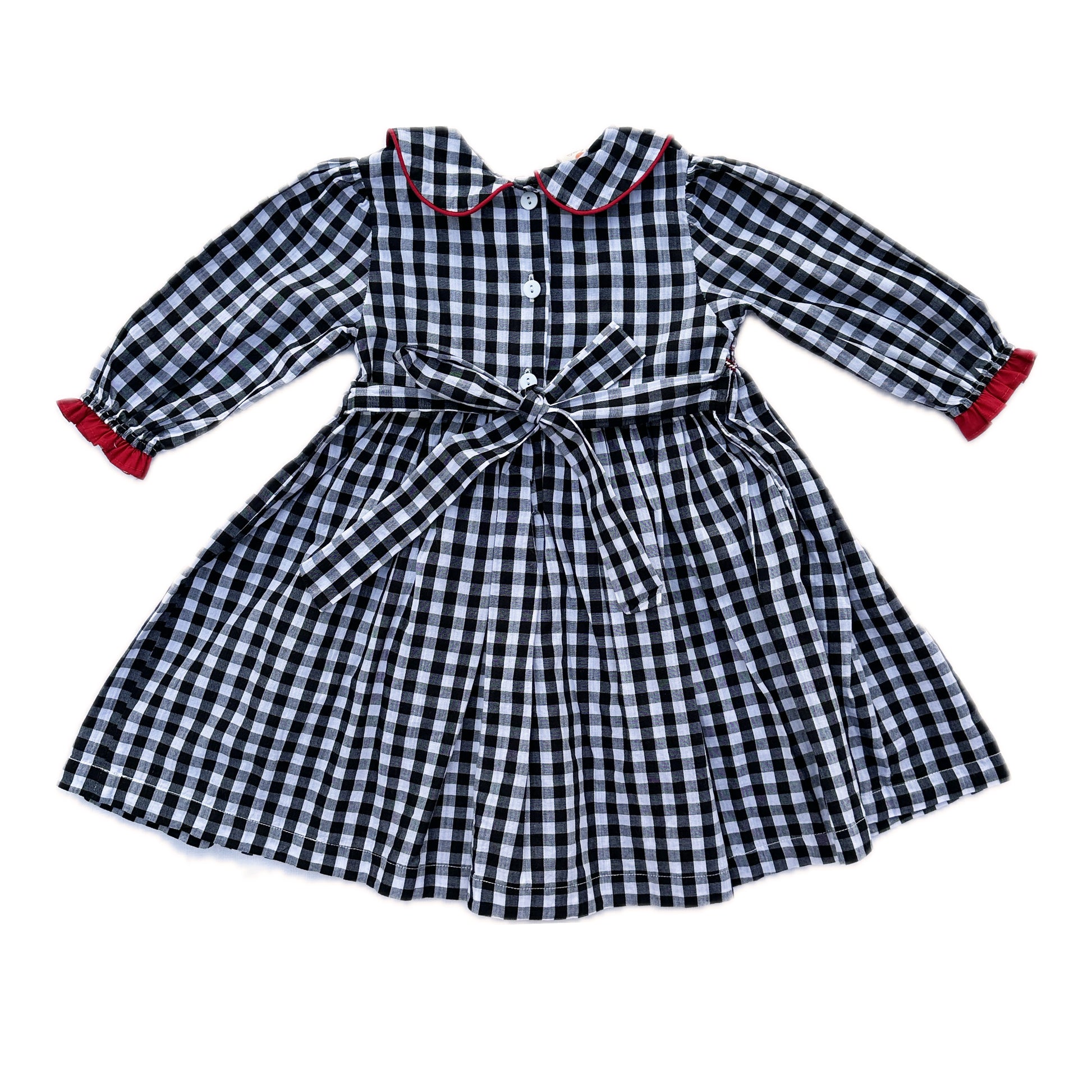 The Black Gingham Smocked Dress is crafted from soft, breathable cotton in a classic black gingham pattern. Featuring neat red smocking across the bodice and a matching red trim at the sleeve ends, it offers a touch of festive charm. It’s perfect for everyday wear, family outings, or as a stylish choice for Christmas celebrations.