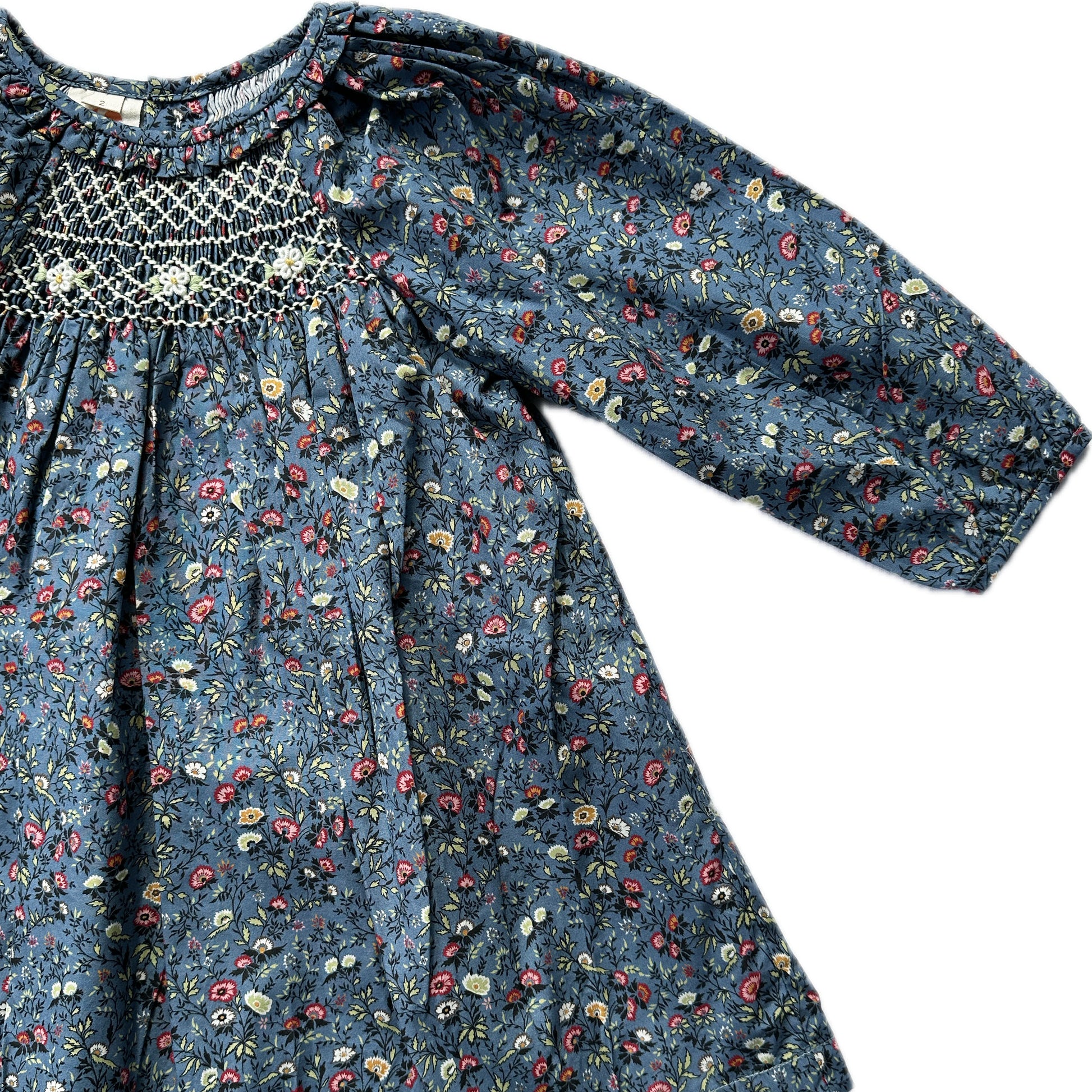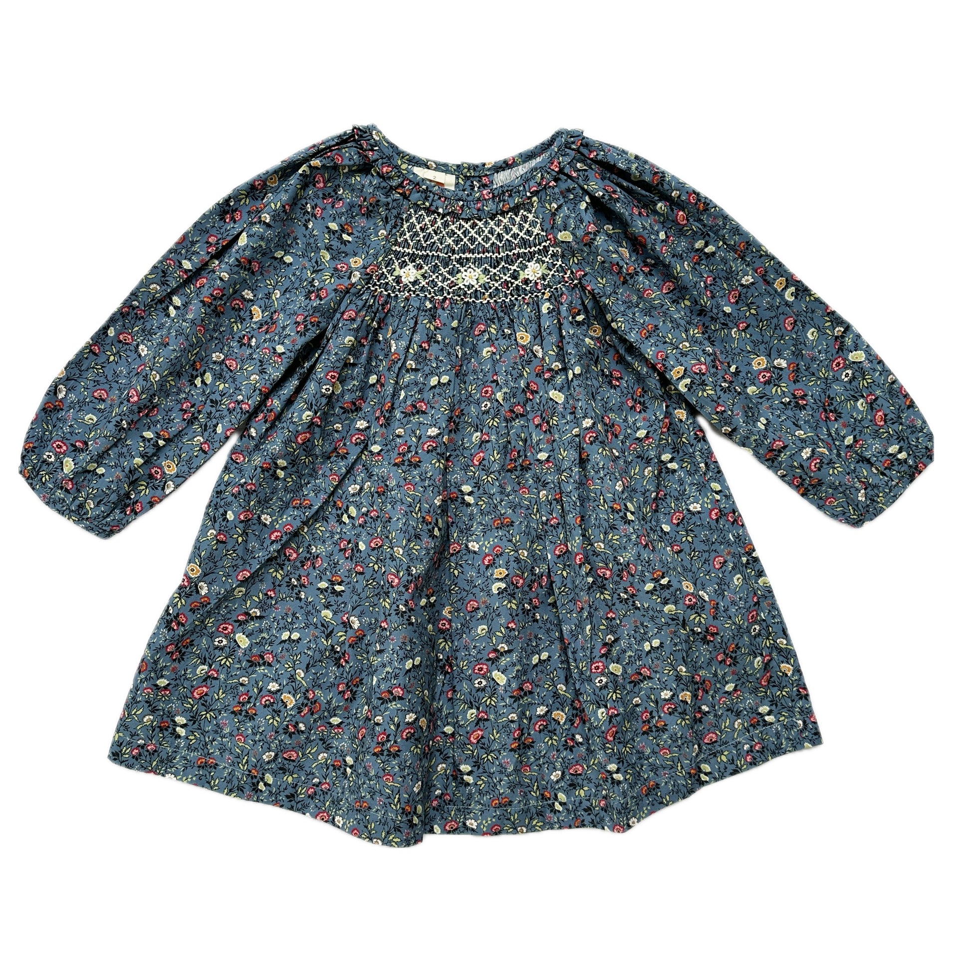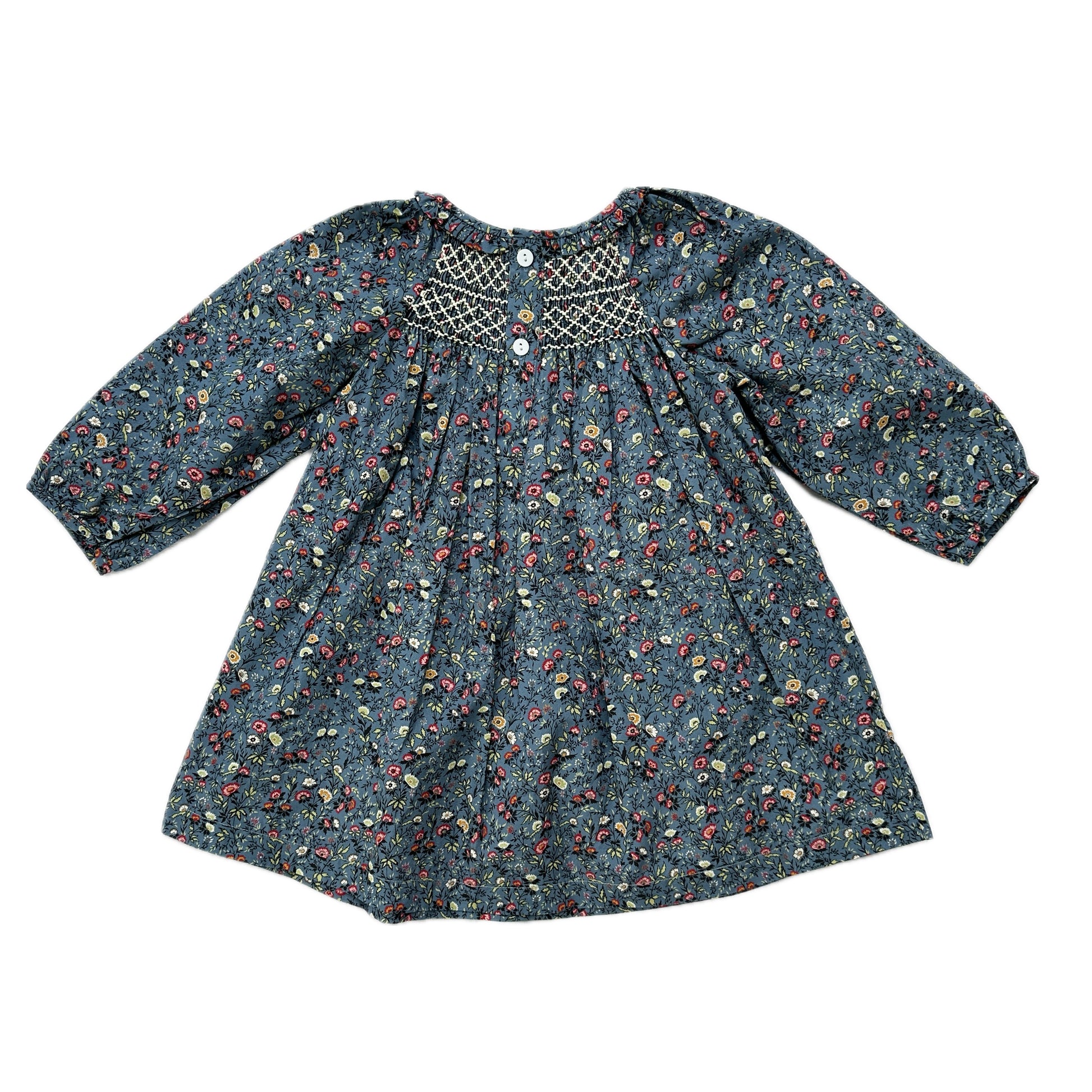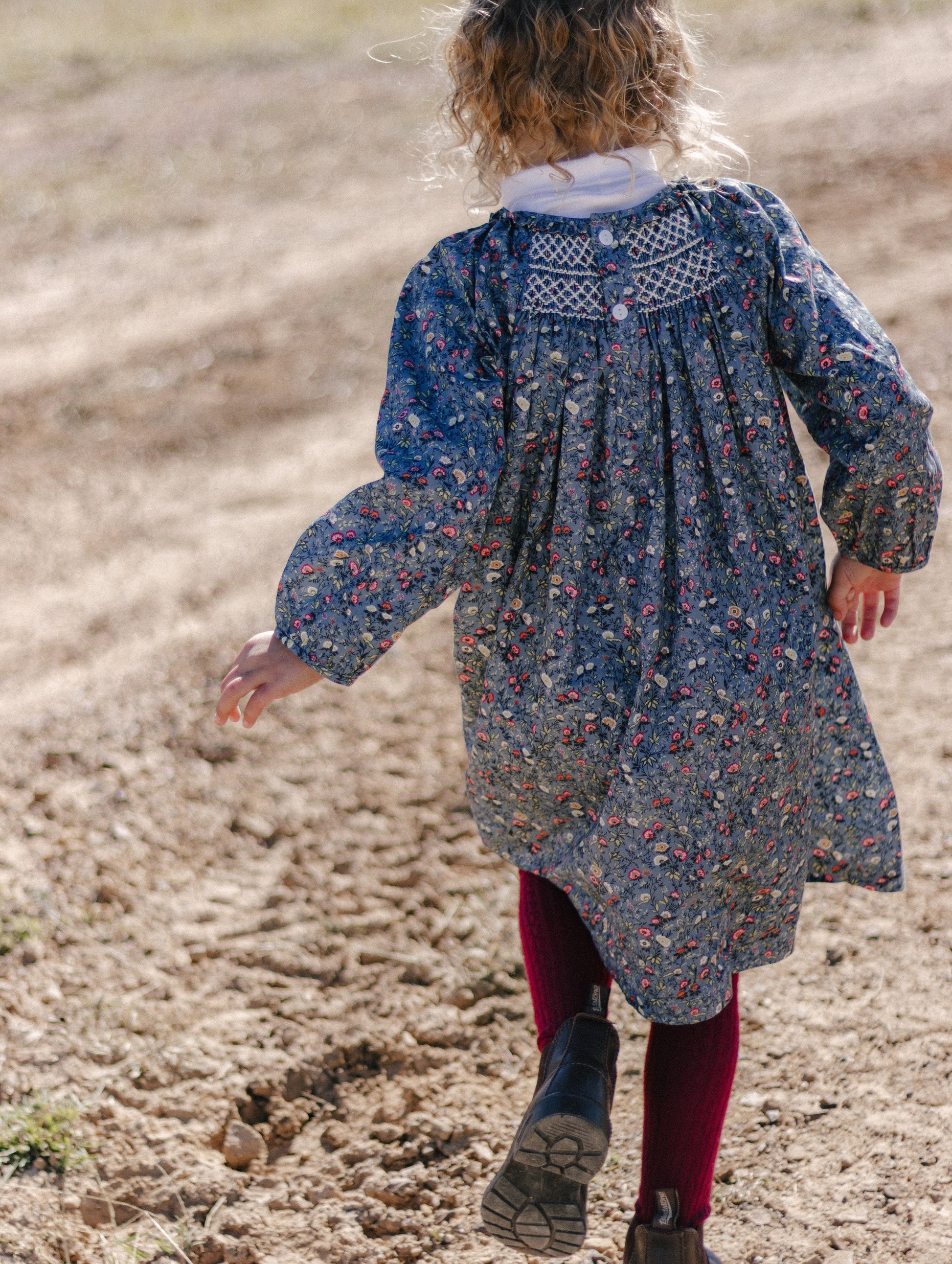 This charming long-sleeved dress is crafted from 100% soft cotton with a delicate navy blue floral print. Featuring elegant smocking details, it offers both comfort and timeless style—perfect for everyday wear or special occasions.