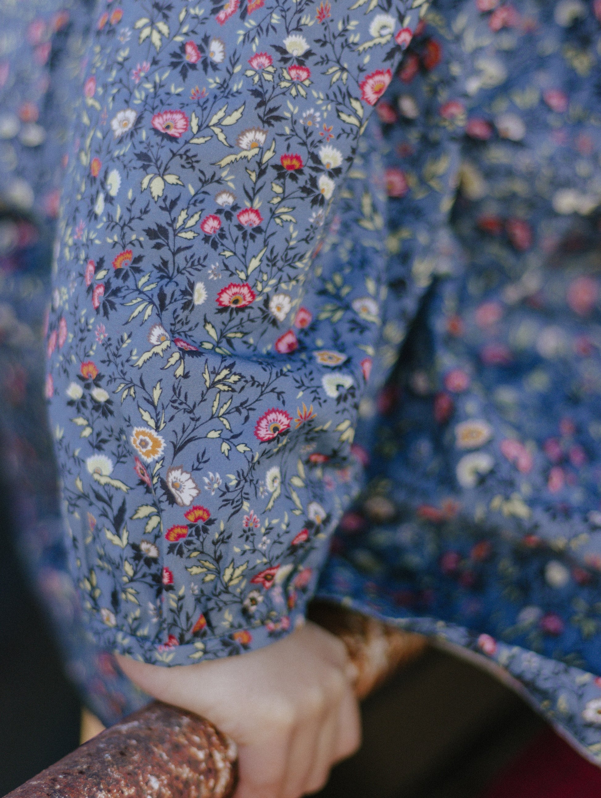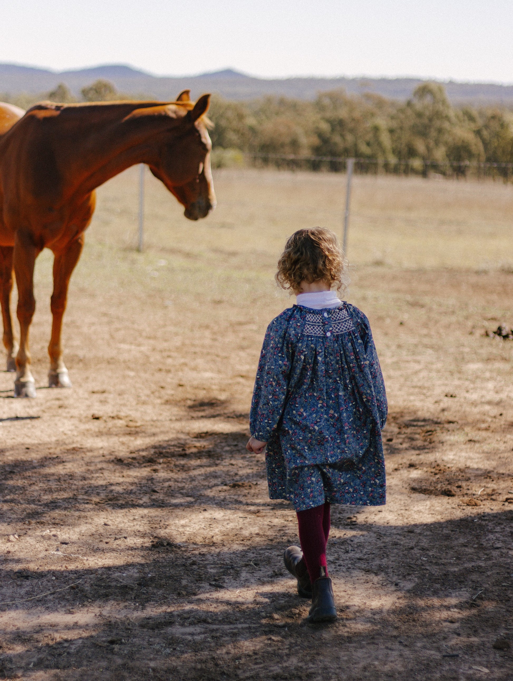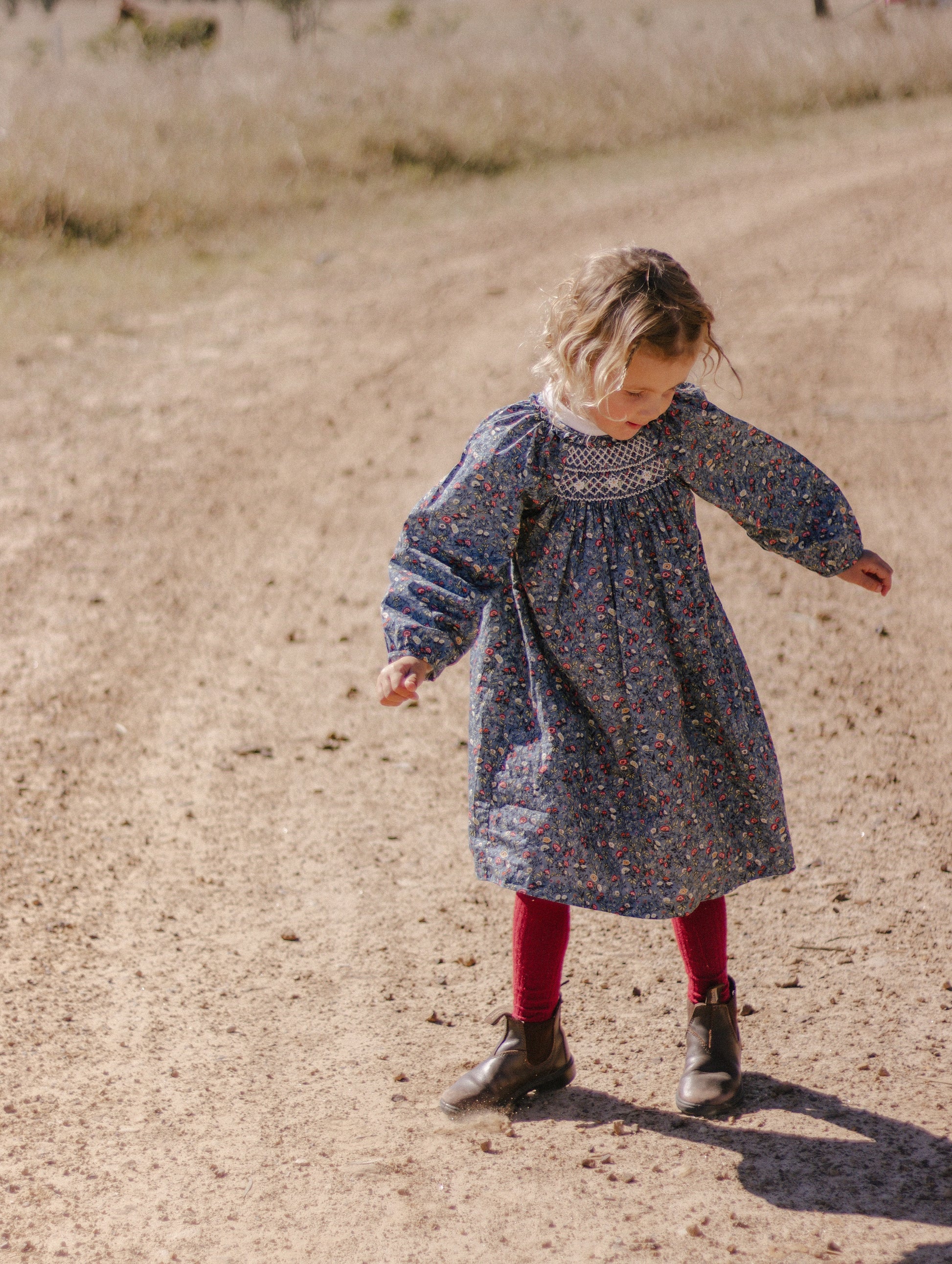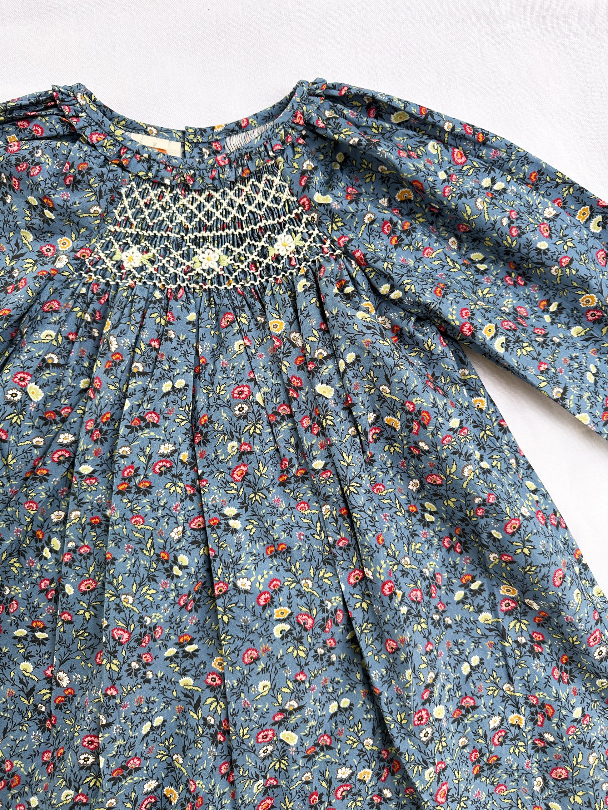 This charming long-sleeved dress is crafted from 100% soft cotton with a delicate navy blue floral print. Featuring elegant smocking details, it offers both comfort and timeless style—perfect for everyday wear or special occasions.
