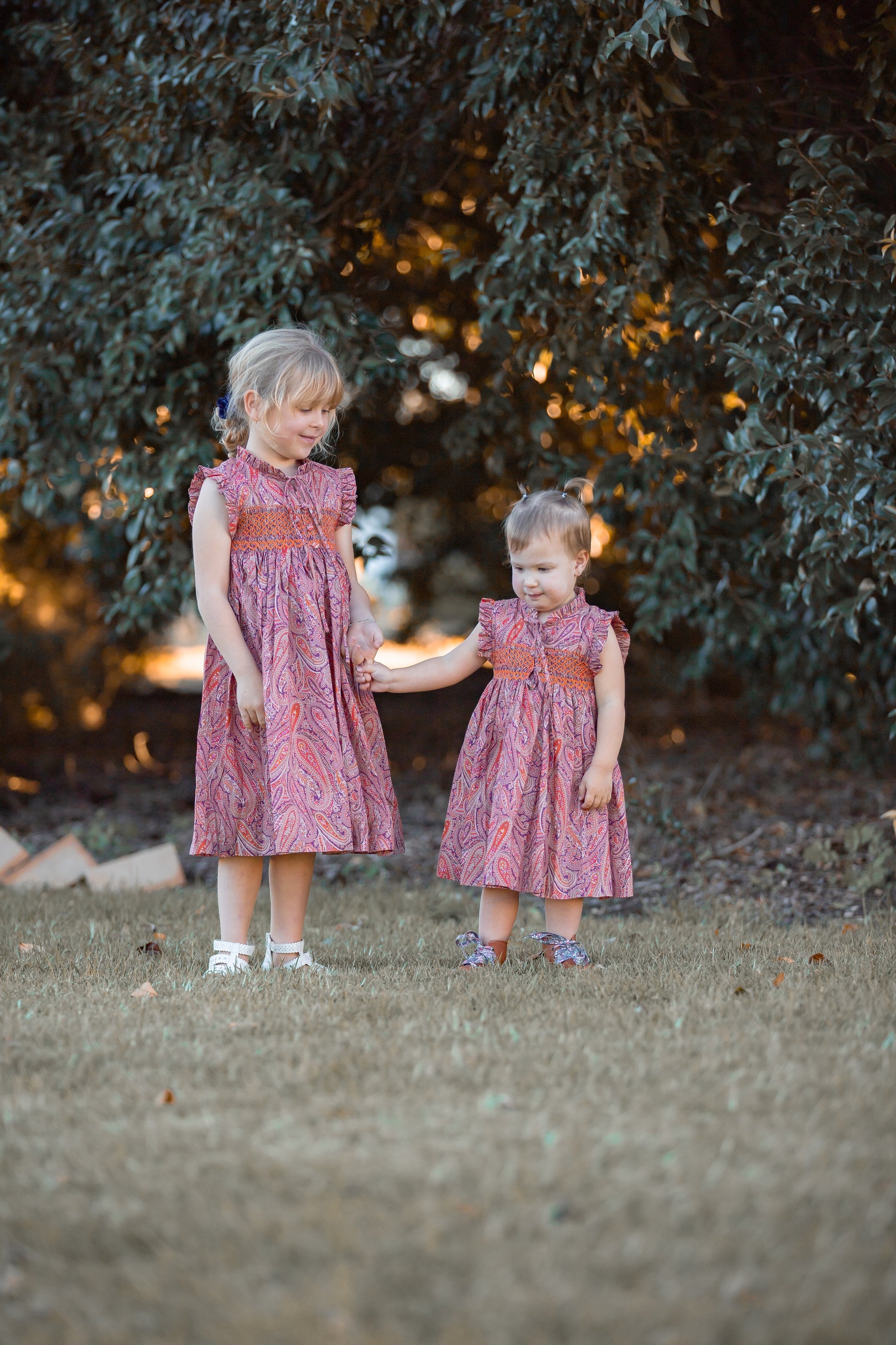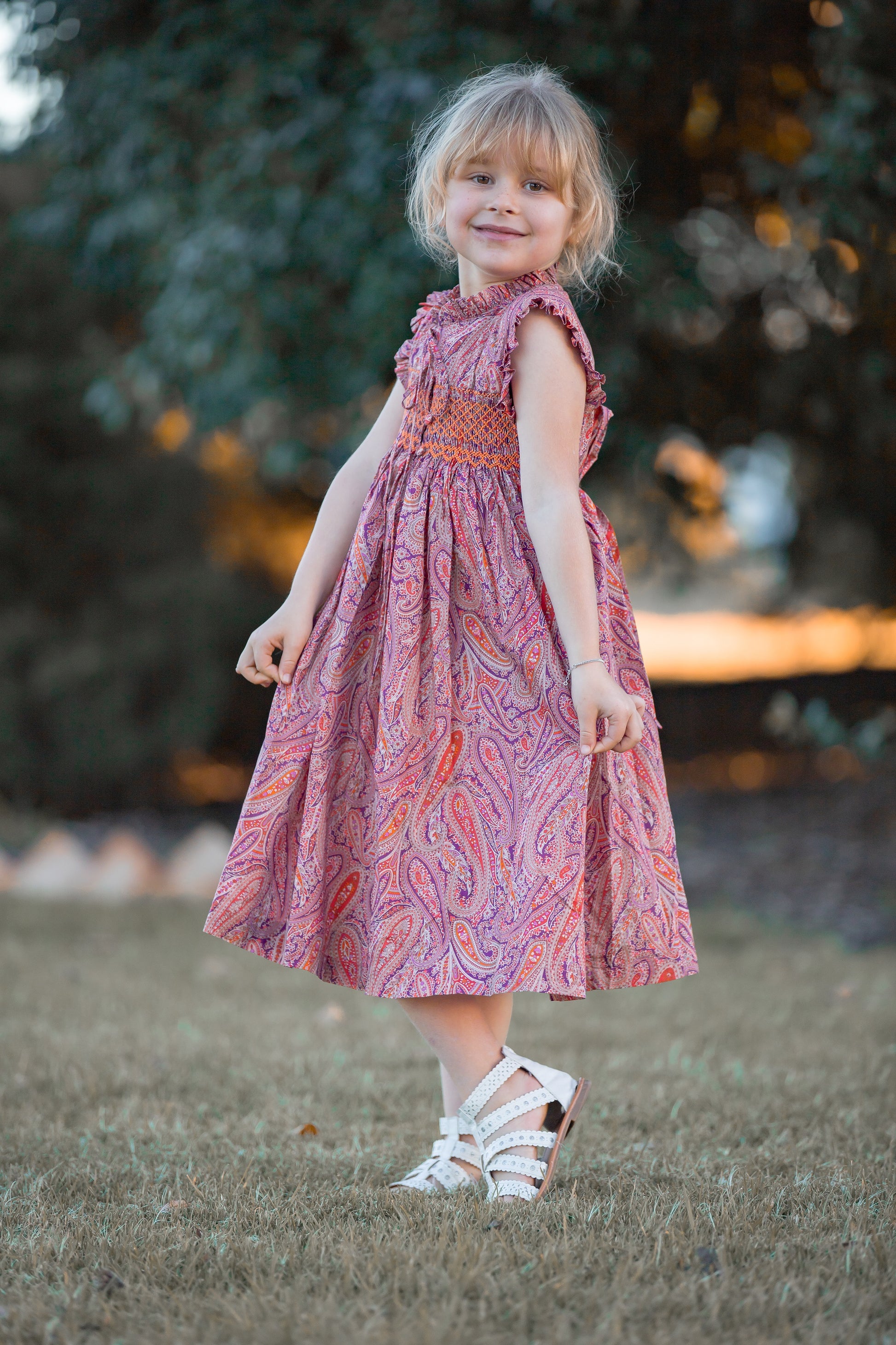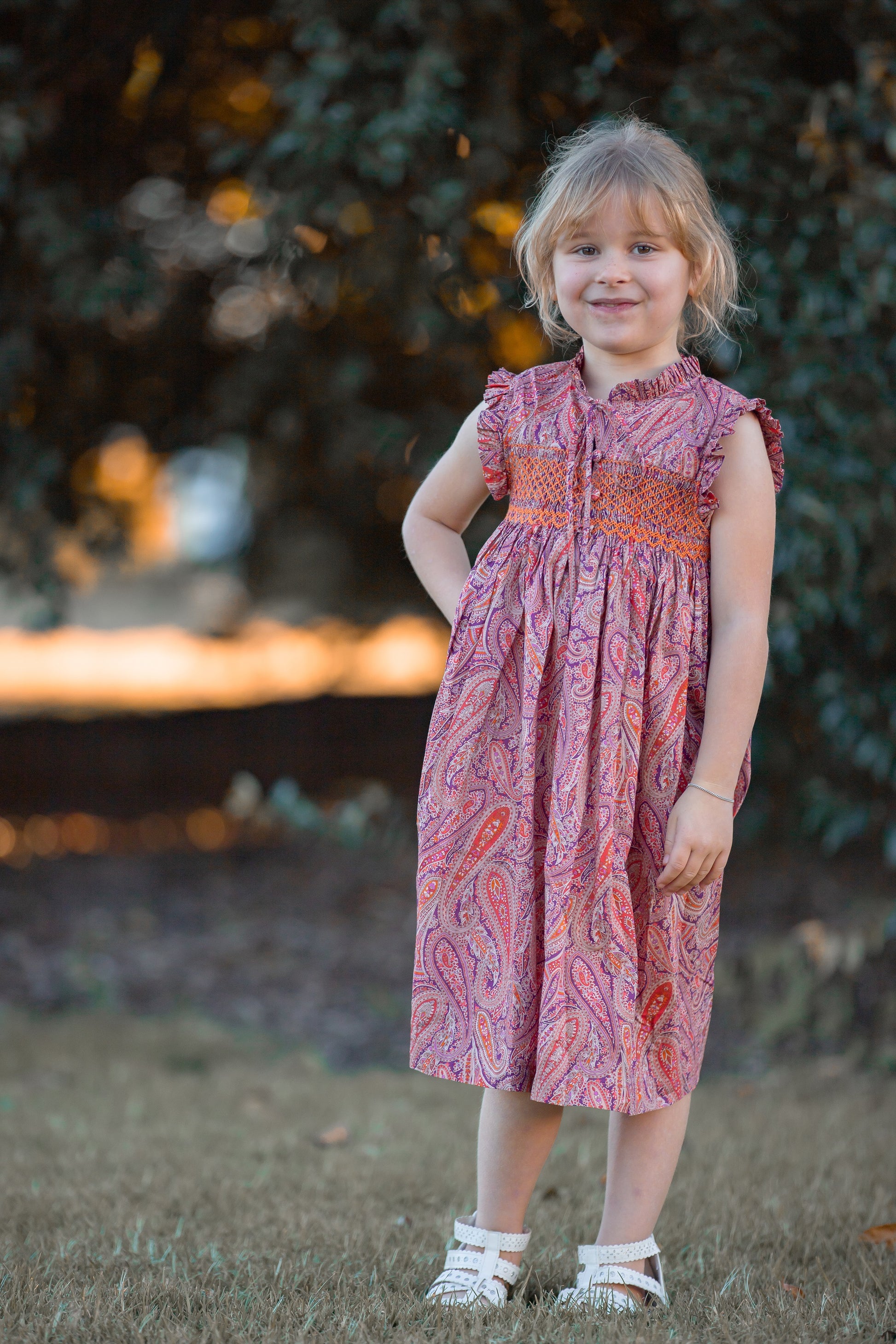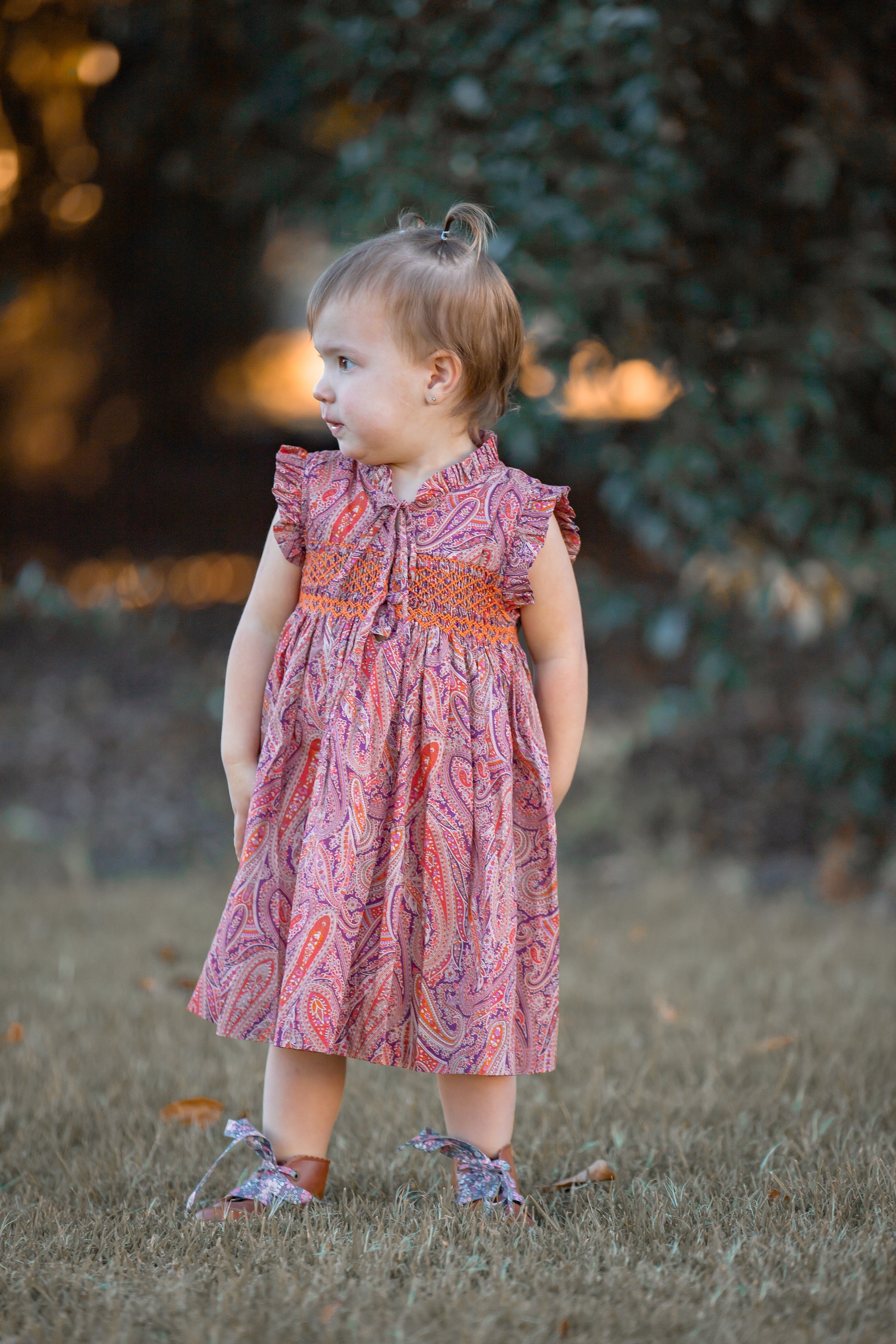 Featuring a warm, glowing hue and intricately smocked details, this dress is a must have for your girl's wardrobe.