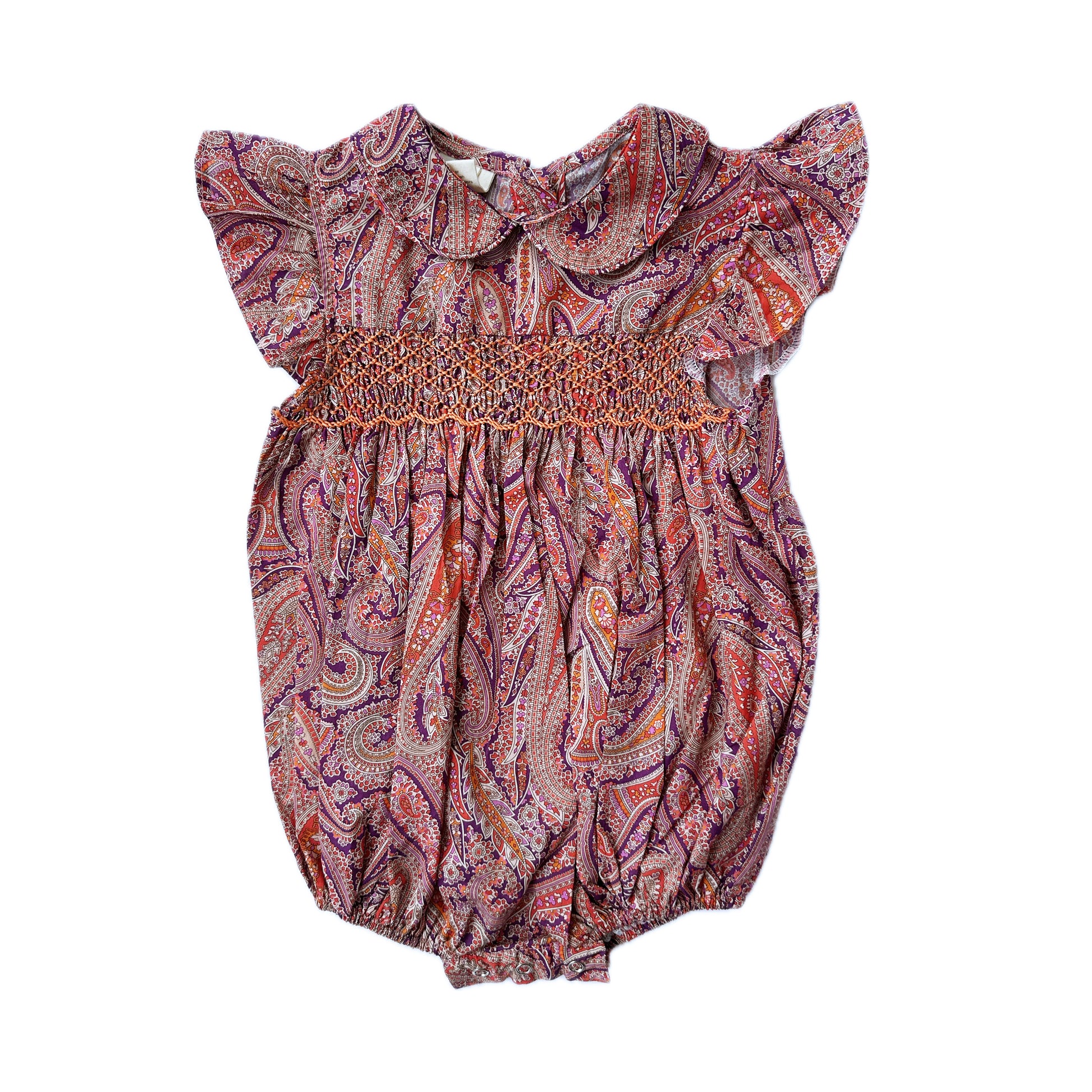 Featuring a warm, glowing hue and intricately smocked details, this romper is a must have for your baby girl's wardrobe.