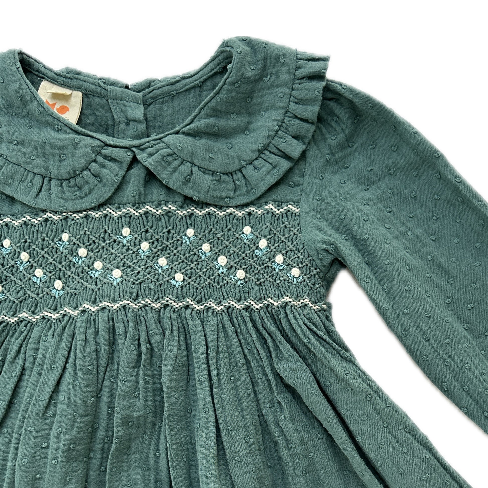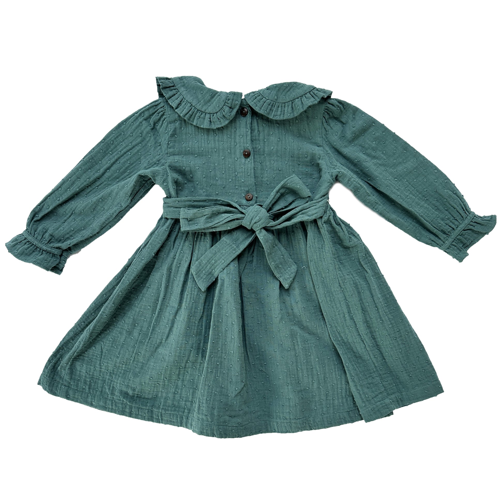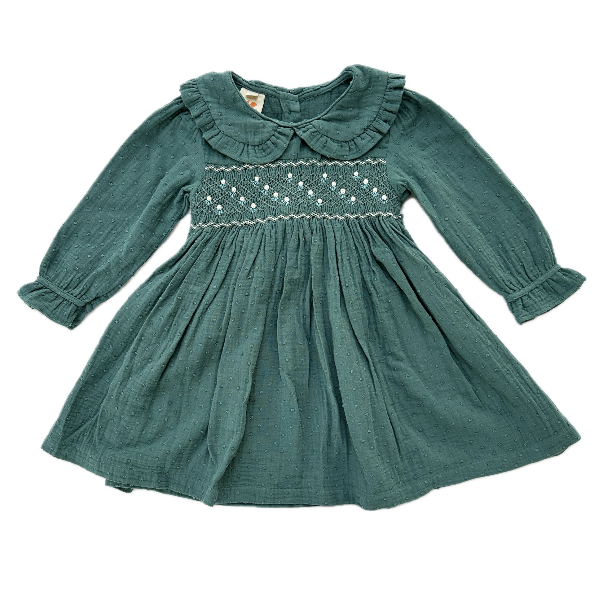 This elegant long-sleeved dress is crafted from 100% soft cotton in a rich emerald green hue. Featuring classic smocking and a comfortable, flowing silhouette, it's ideal for cooler days—perfect for everyday elegance or more refined occasions.