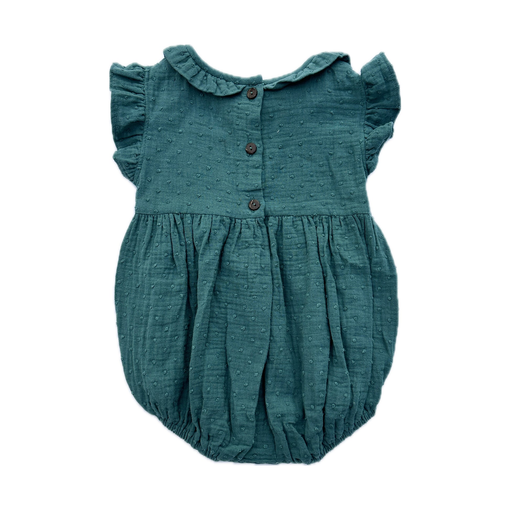 This elegant romper is crafted from 100% soft cotton in a rich emerald green hue. Featuring classic smocking and a comfortable, flowing silhouette, it's ideal for cooler days—perfect for everyday elegance or more refined occasions.