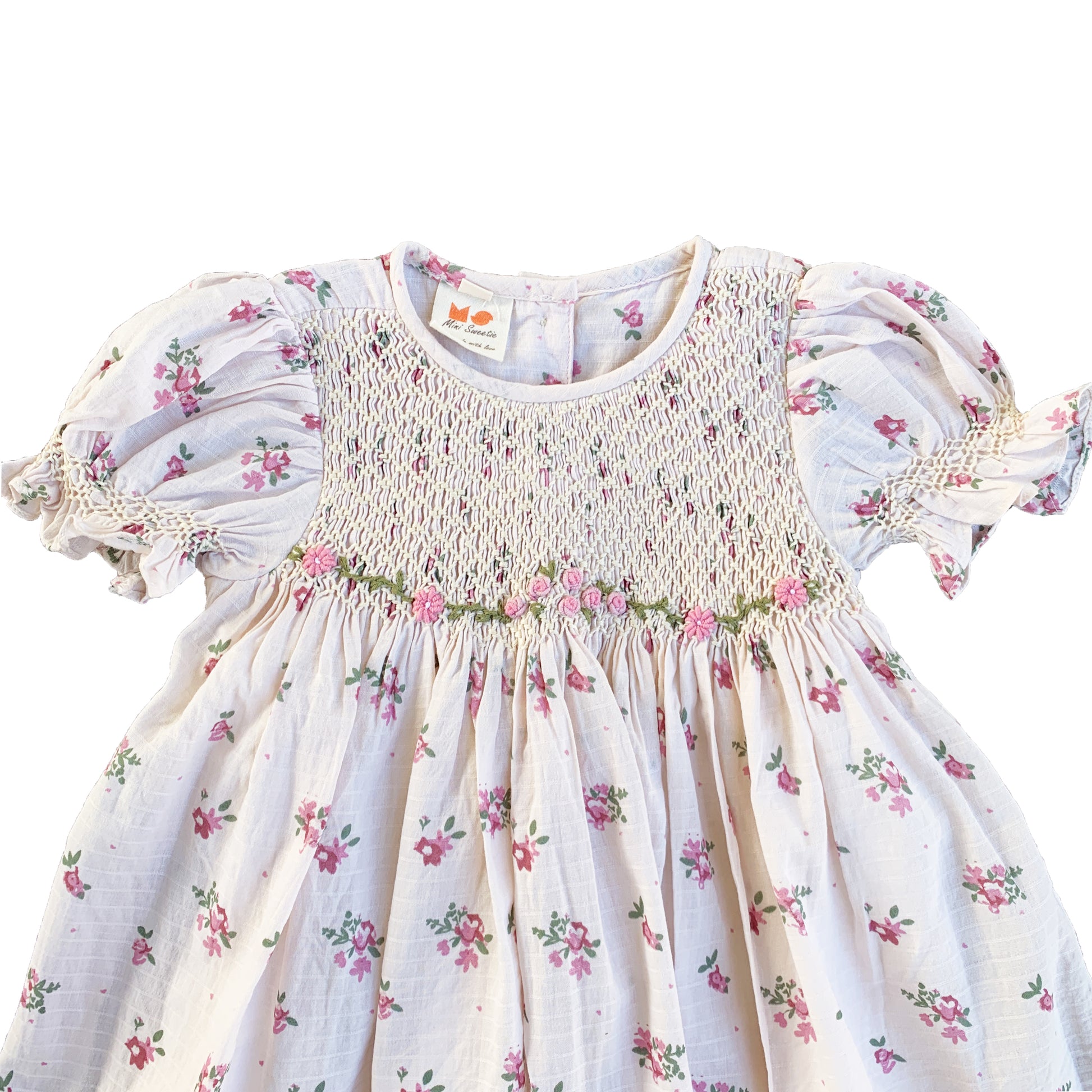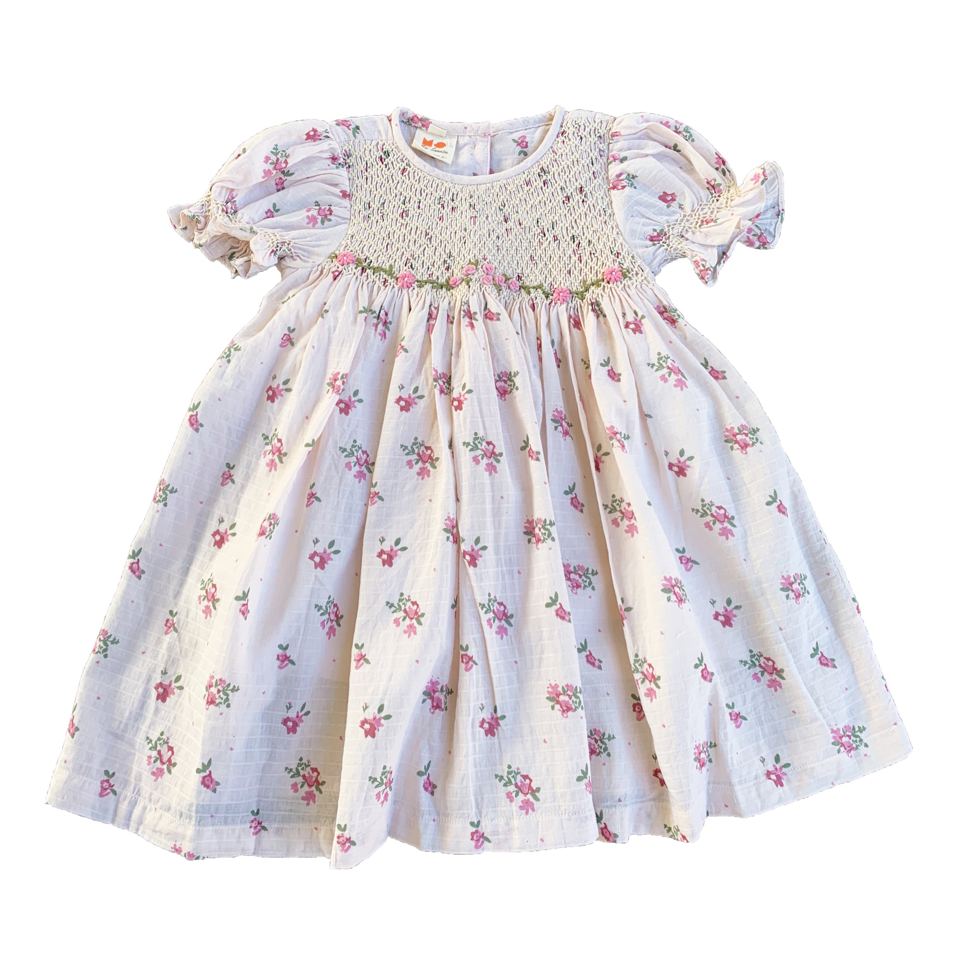 This lovely dress features a cream-colored fabric adorned with delicate pink and purple flowers. The smocked detailing adds a charming touch to the overall design, making it a perfect choice for a stylish and elegant look.