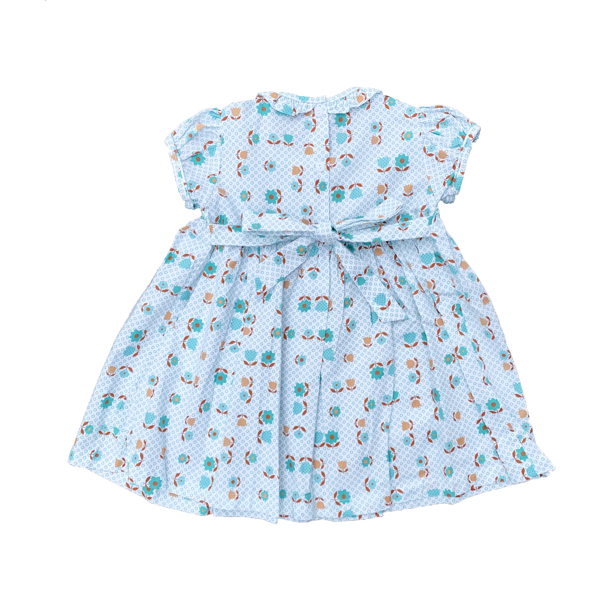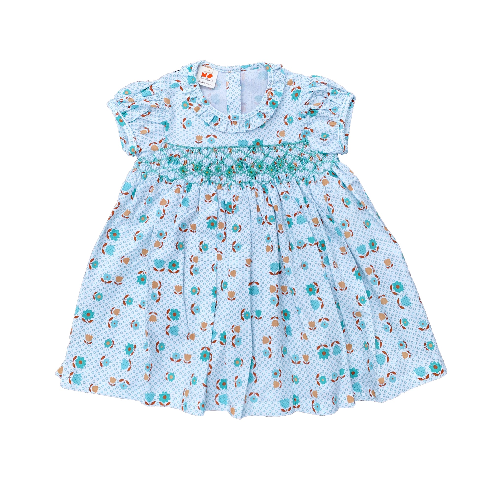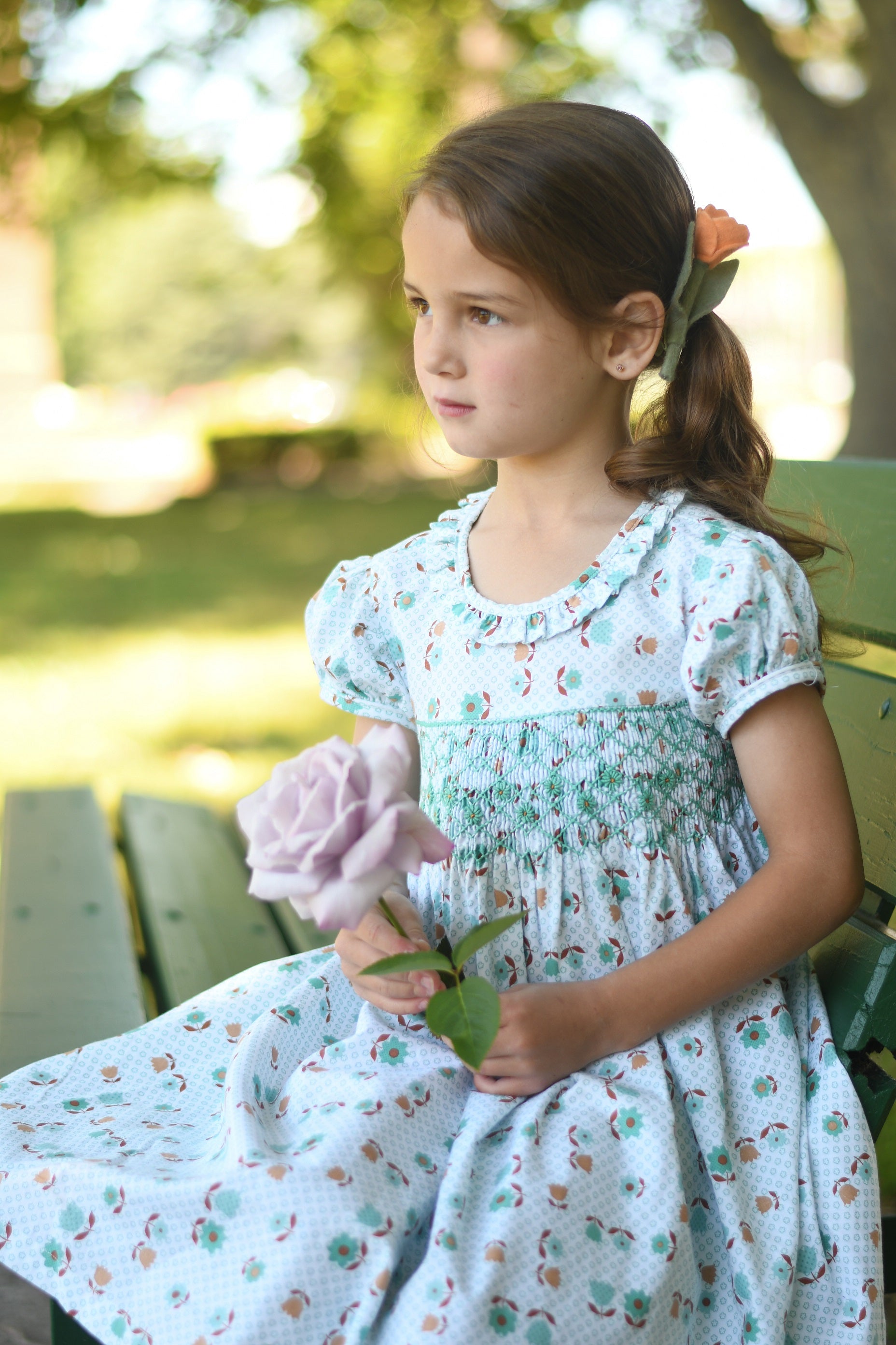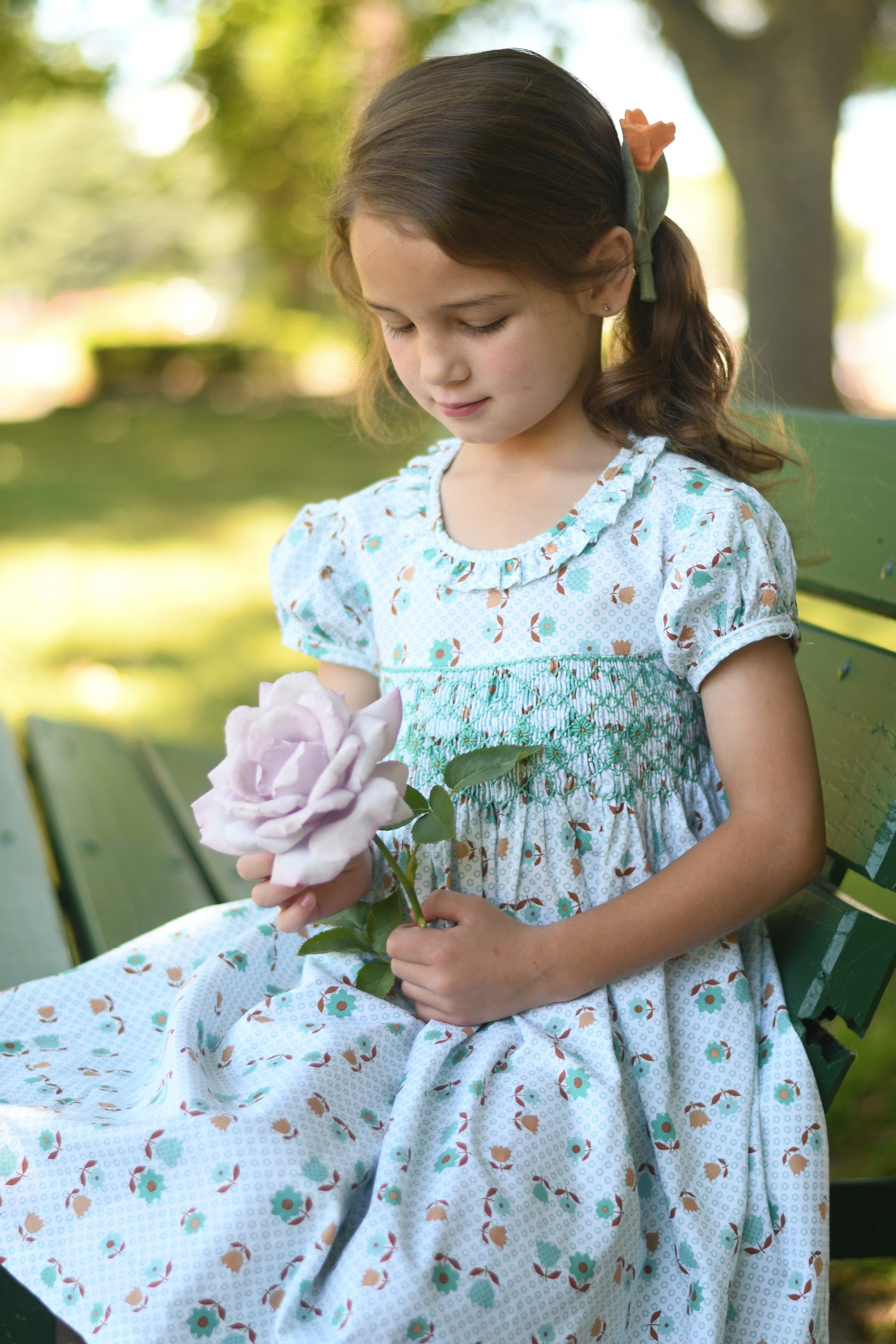 This elegant smocked dress is made of high quality jade green and brown floral fabric and finished off with green stitch hand smocking around the chest.