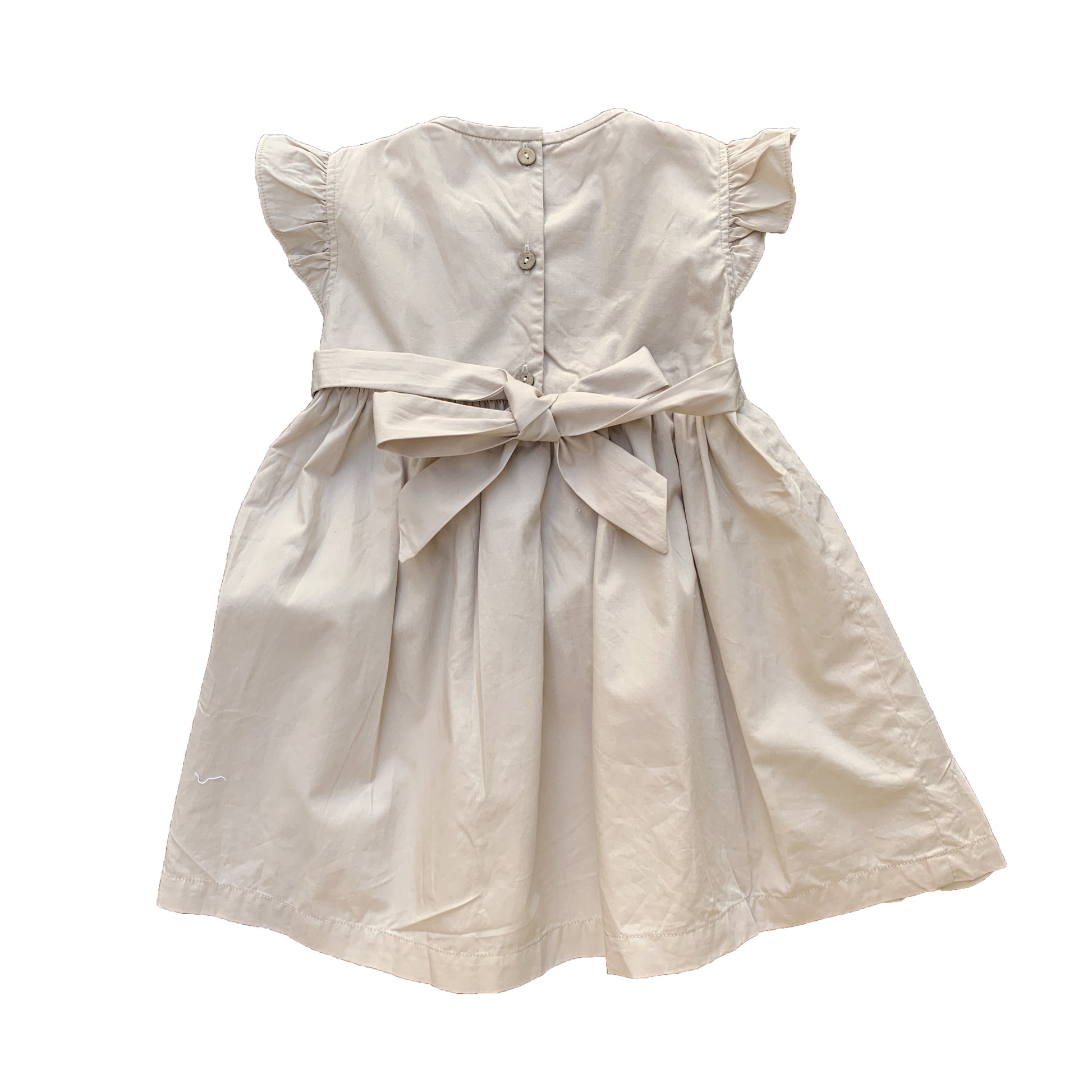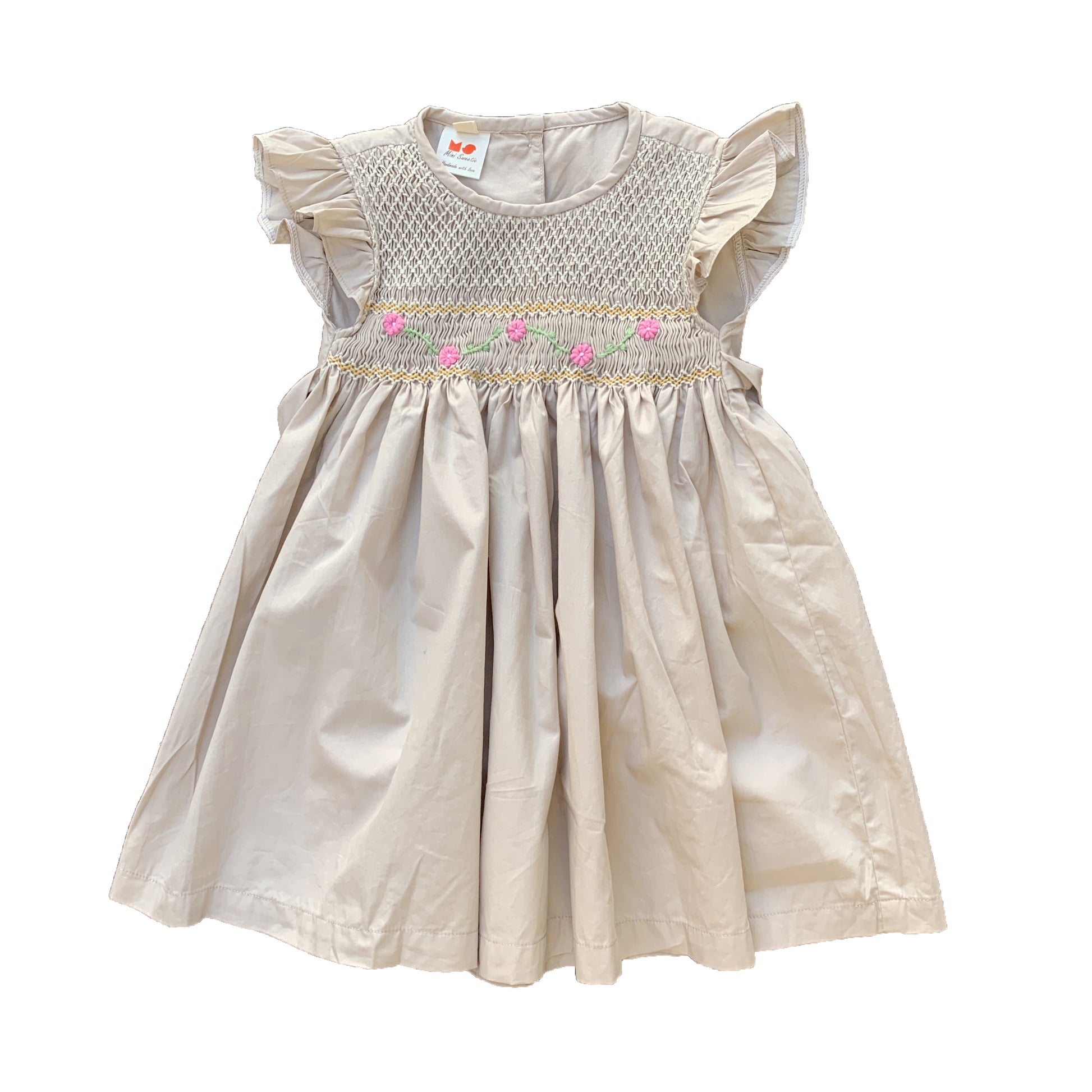 A beautiful creamy dreamy dress! It is made of cotton, hand smocked from shoulder to chest and embroidered with pink flowers.