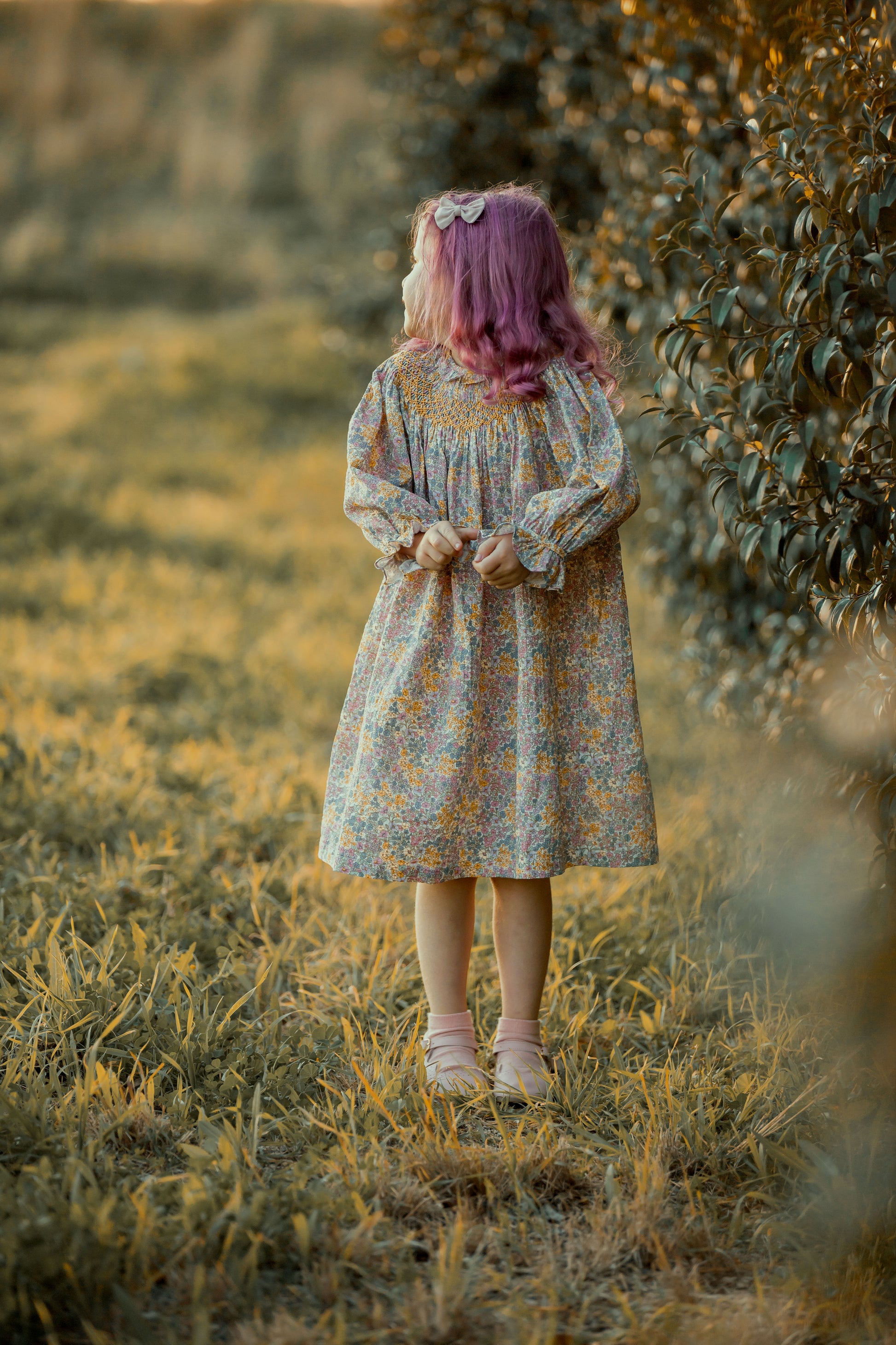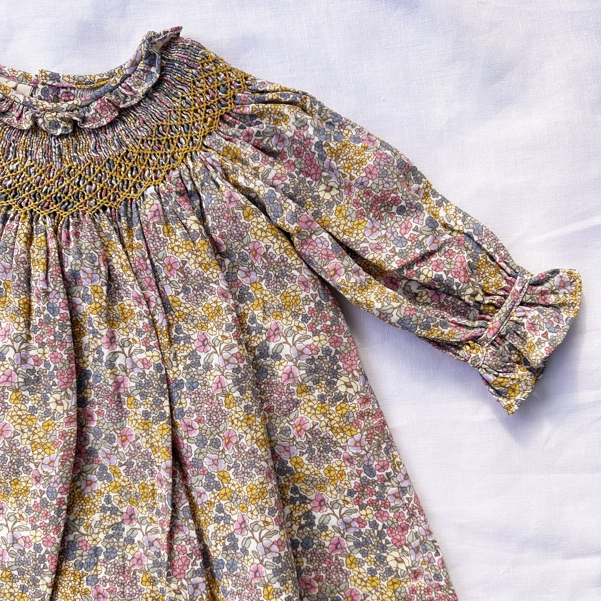 This dress is made from 100% soft cotton, featuring a gentle floral pattern in yellow, pink, and gray on a warm yellow-toned background. With its classic smocking and comfortable fit, it’s perfect for sunny days, casual outings, or dressed-up gatherings.
