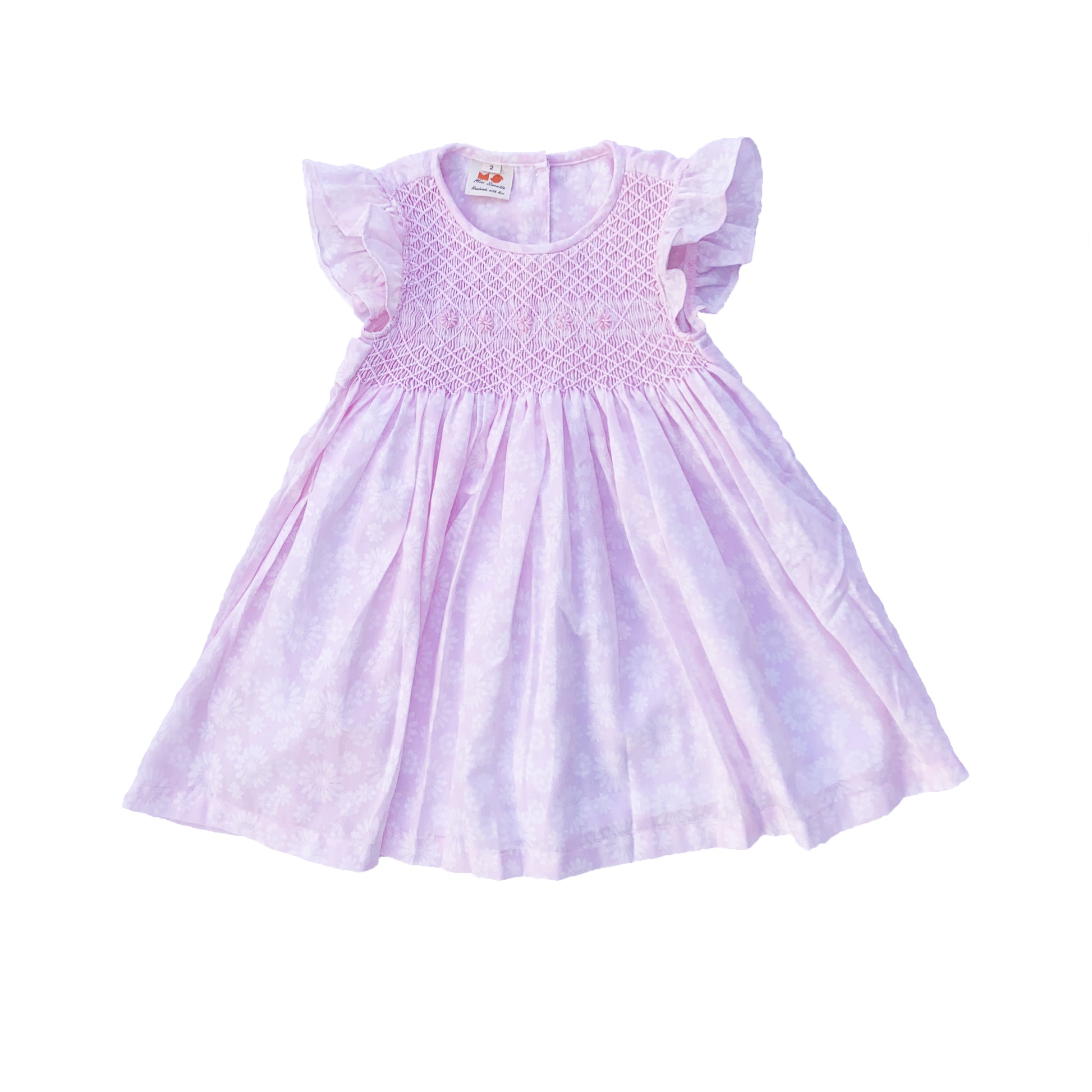 This is one of the sweetest dresses that we've ever made. Hand smocking from shoulder to chest on the pink daisy fabric, with fluttery sleeves, the dress is perfect for any occasions.