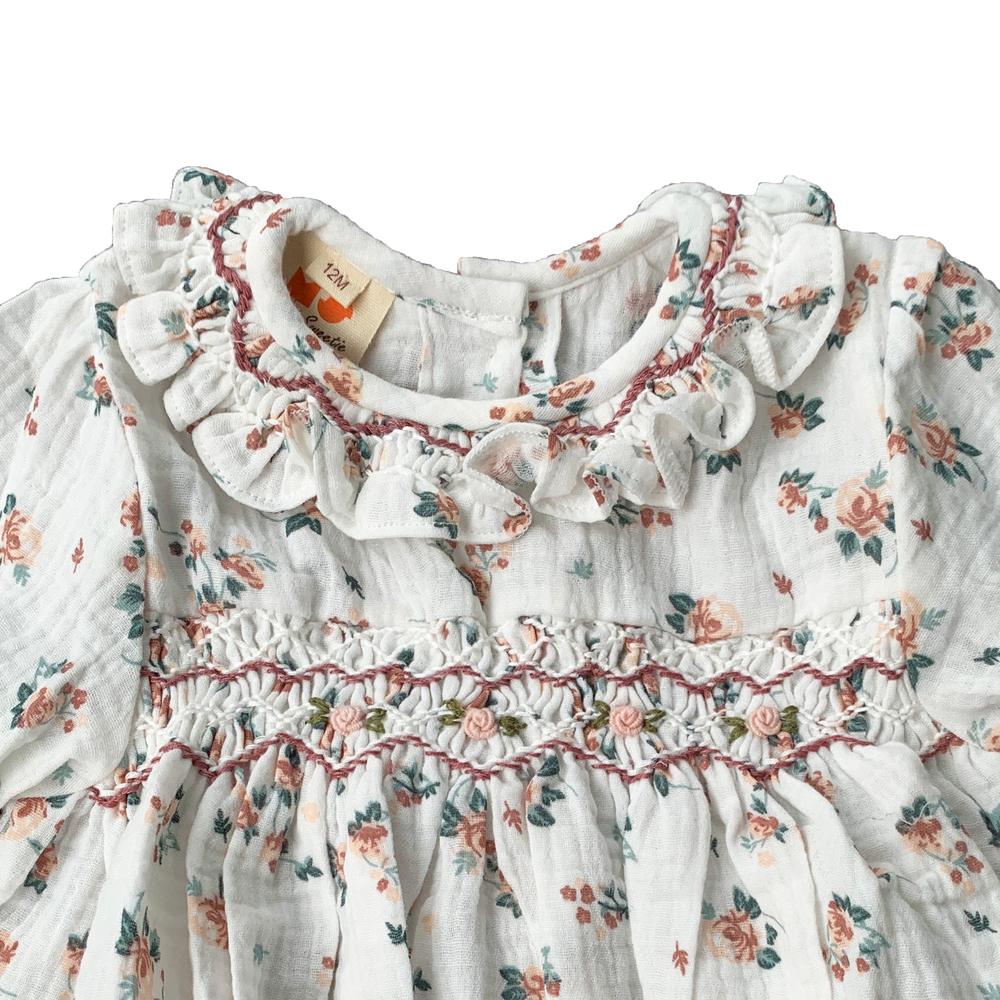 This lovely long sleeve romper is made from high quality cotton with delicate hand smocked and embroidery. The romper is hand made with care and love. Comfortable and perfect for everyday wear.
