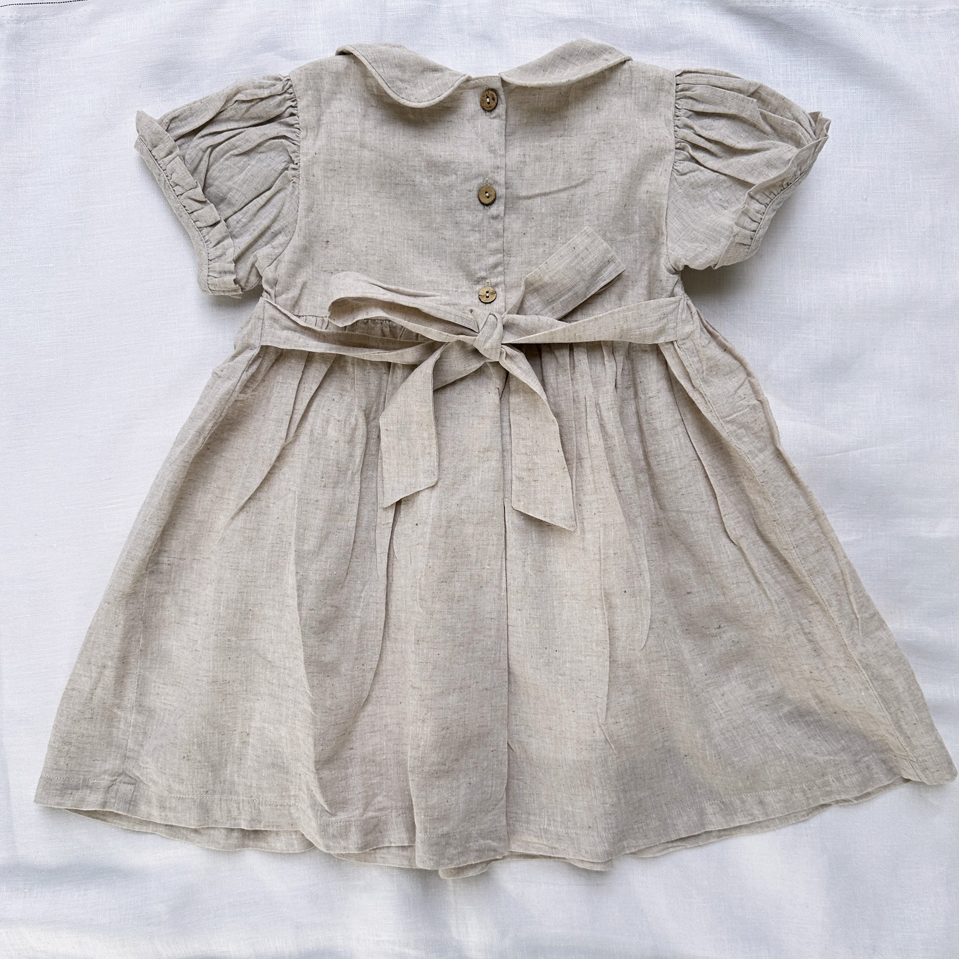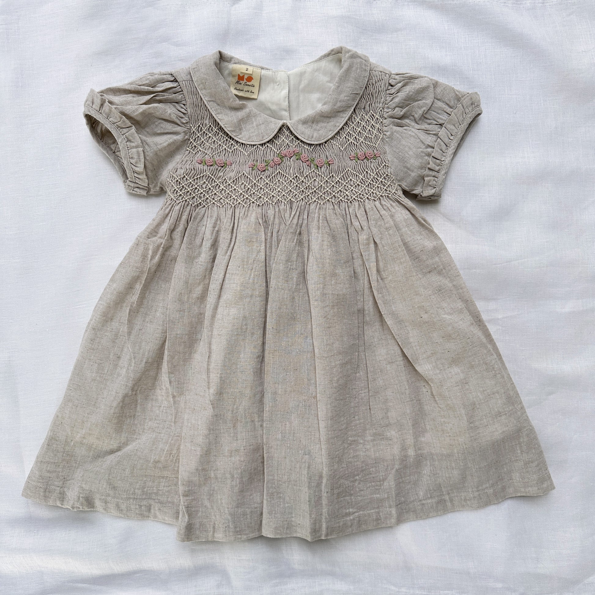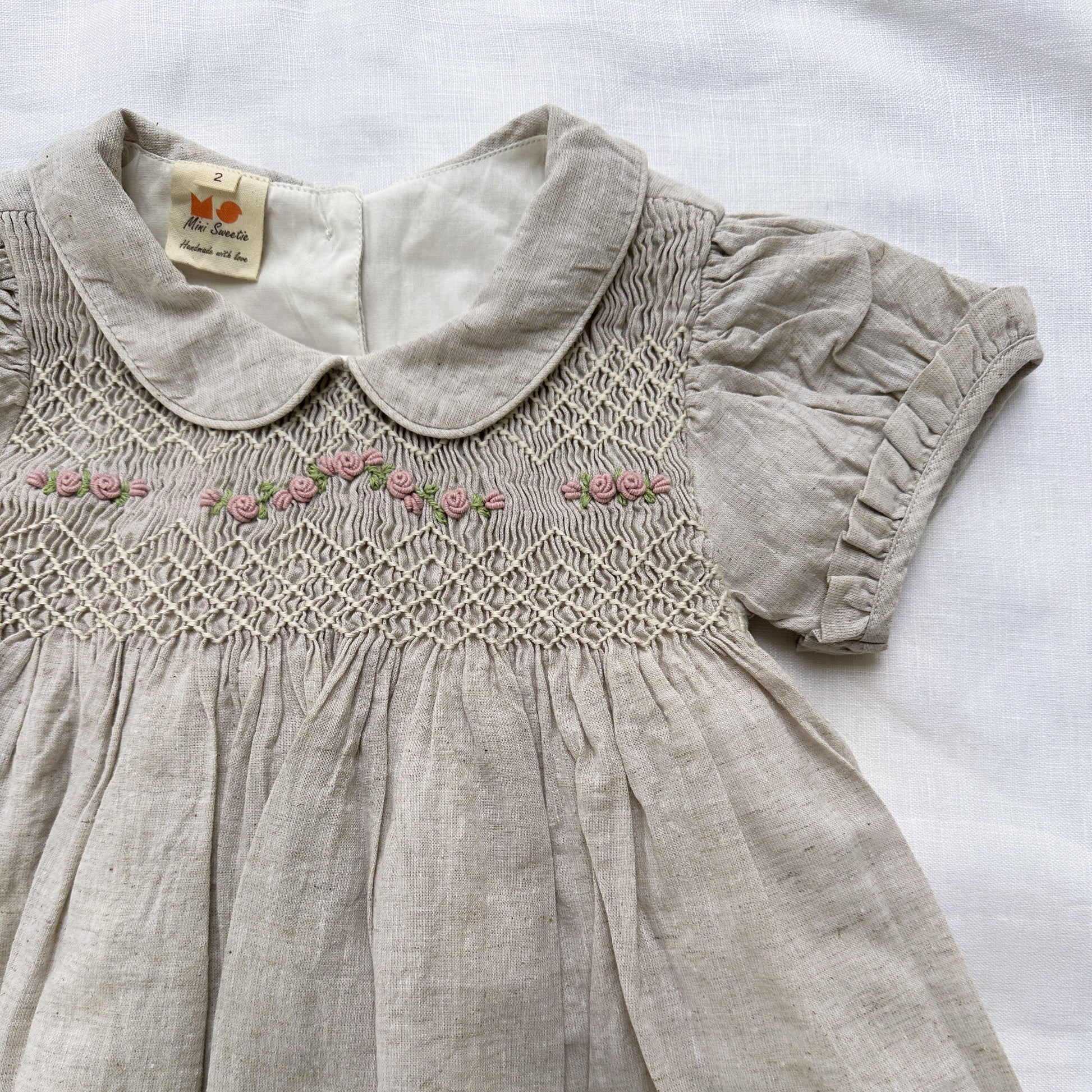 This soft, short-sleeved dress is made from linen cotton blend in a refined gray tone, delicately accented with embroidered pink flowers. With classic smocking and a graceful silhouette, it offers both comfort and quiet elegance—perfect for everyday moments and special occasions alike.