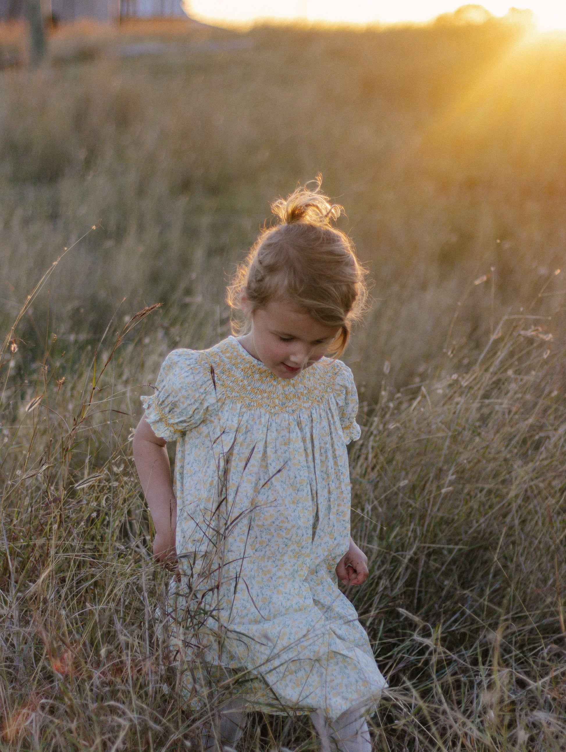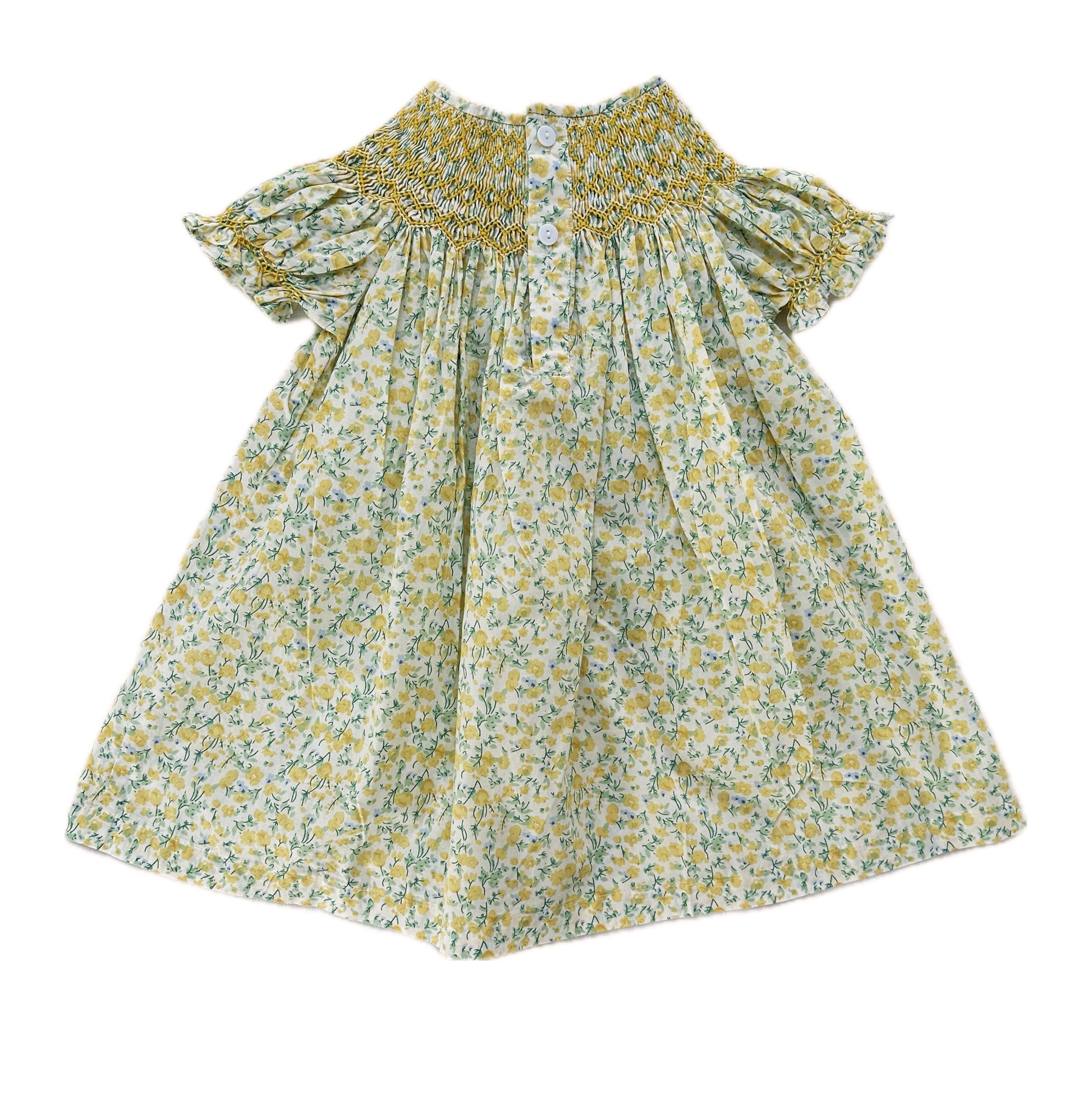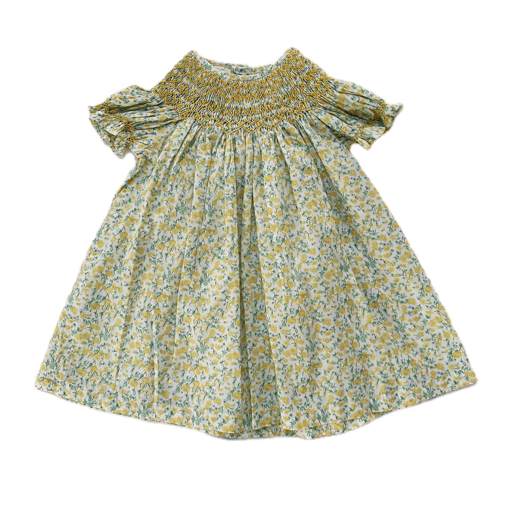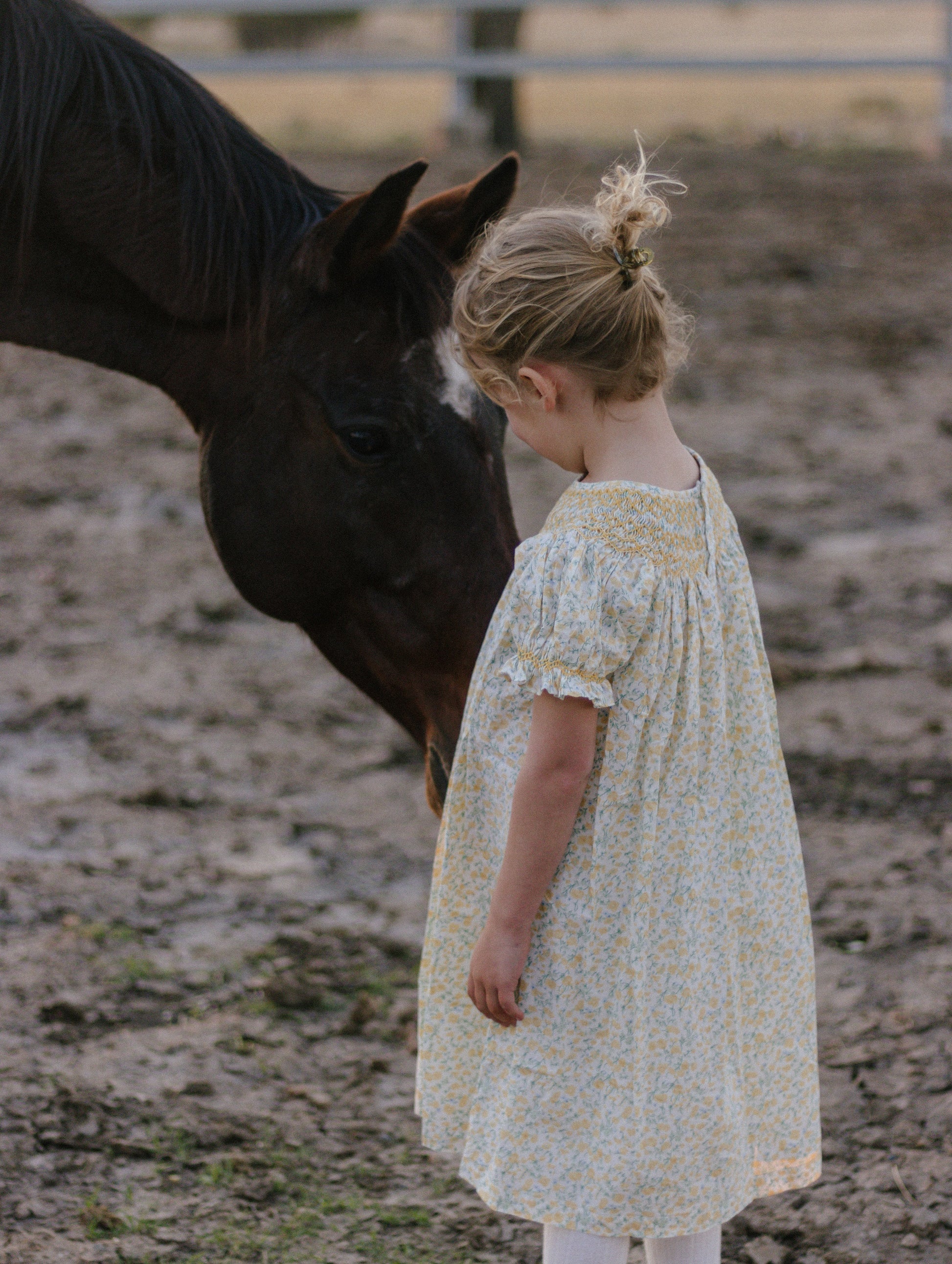 This cheerful short-sleeved dress is made from 100% soft cotton, featuring a delicate print of tiny flowers on a warm yellow background. With its classic smocked detail and airy comfort, it’s perfect for bright everyday moments and special sunny-day occasions.
