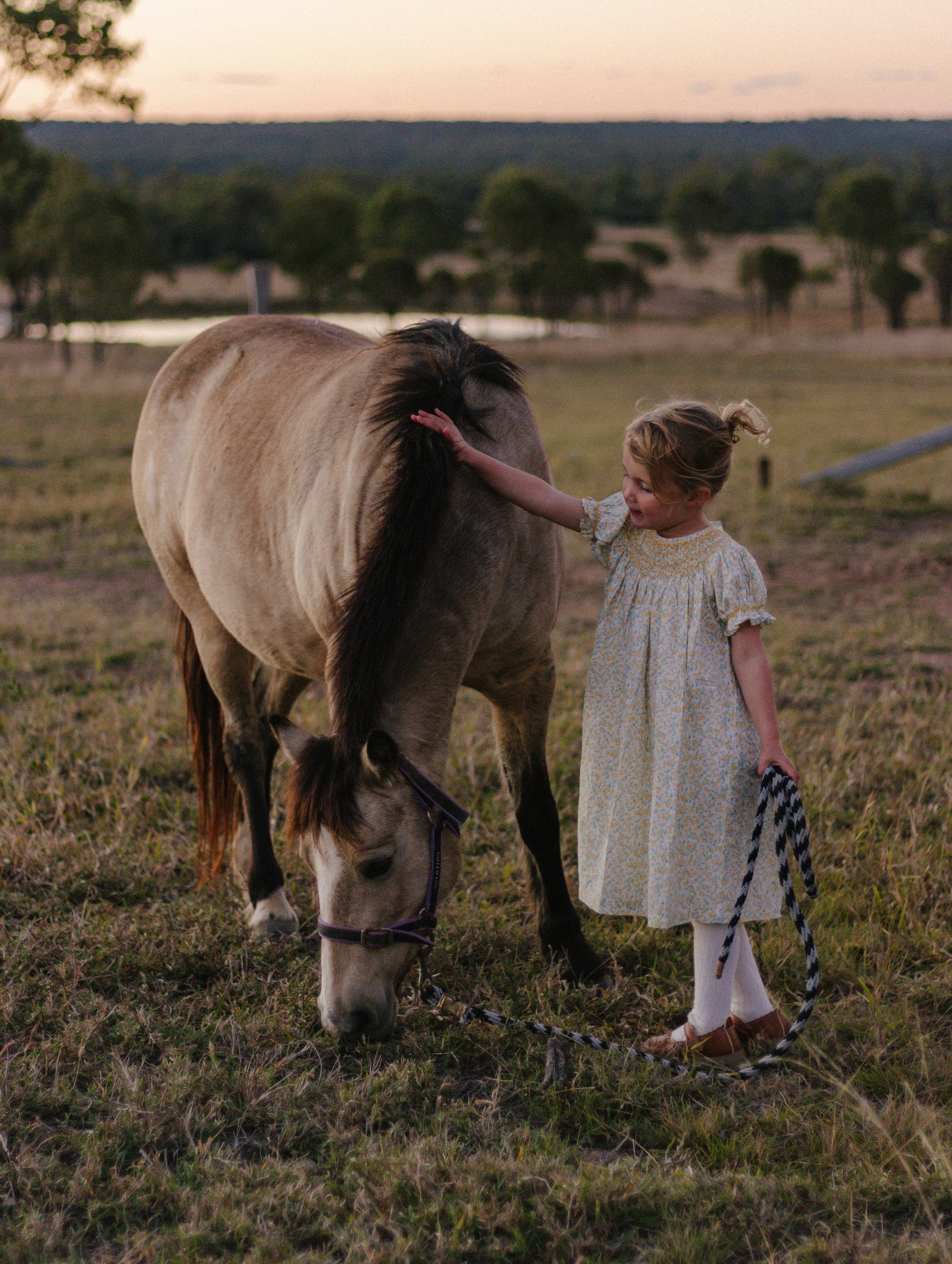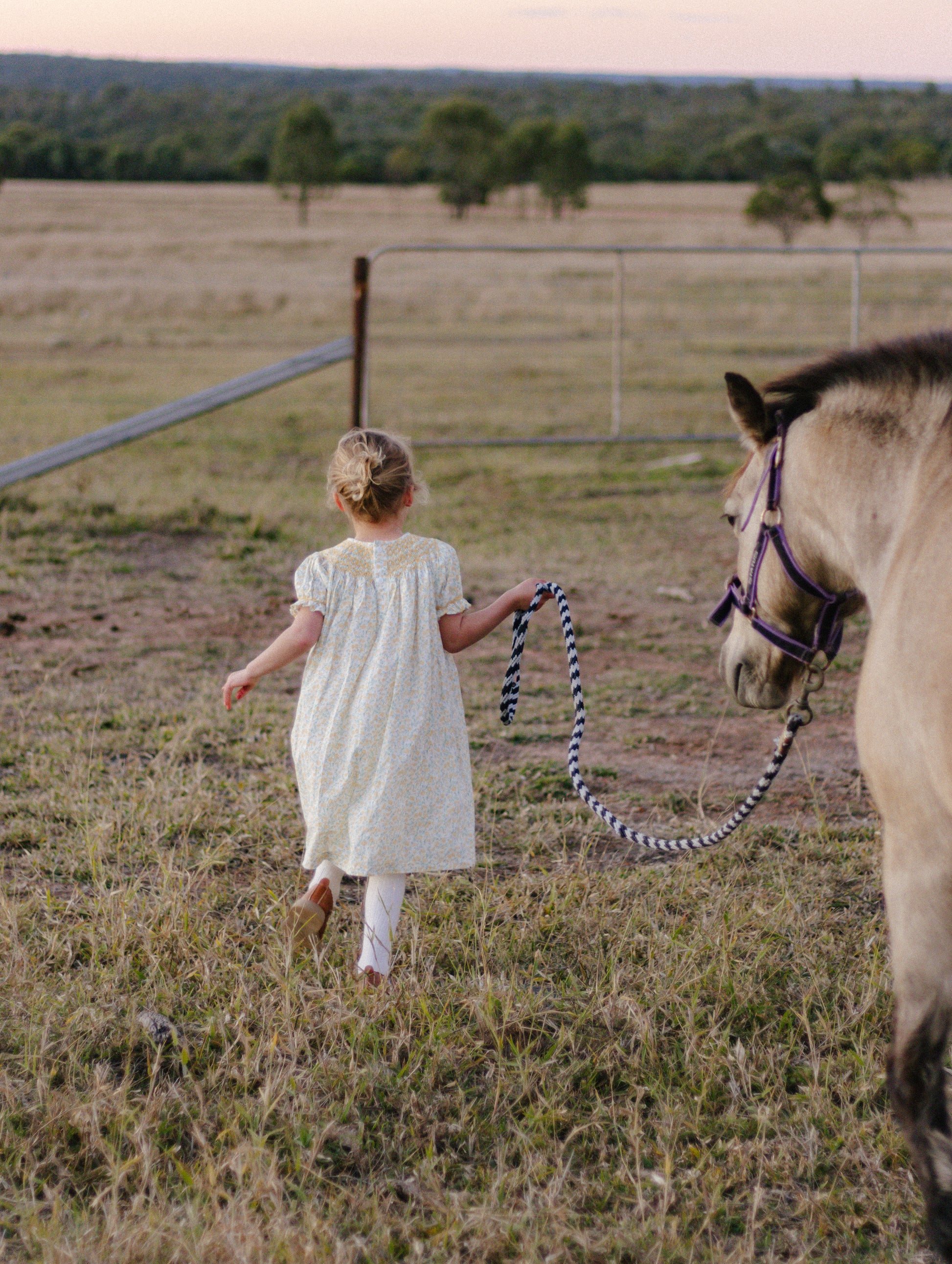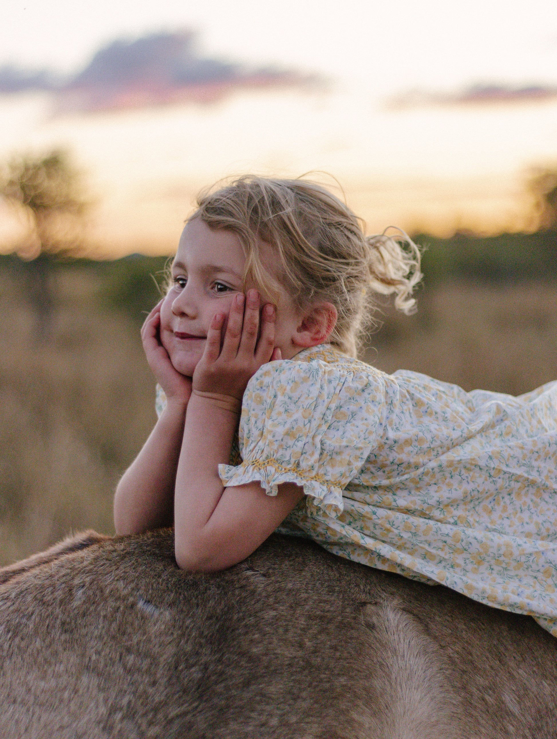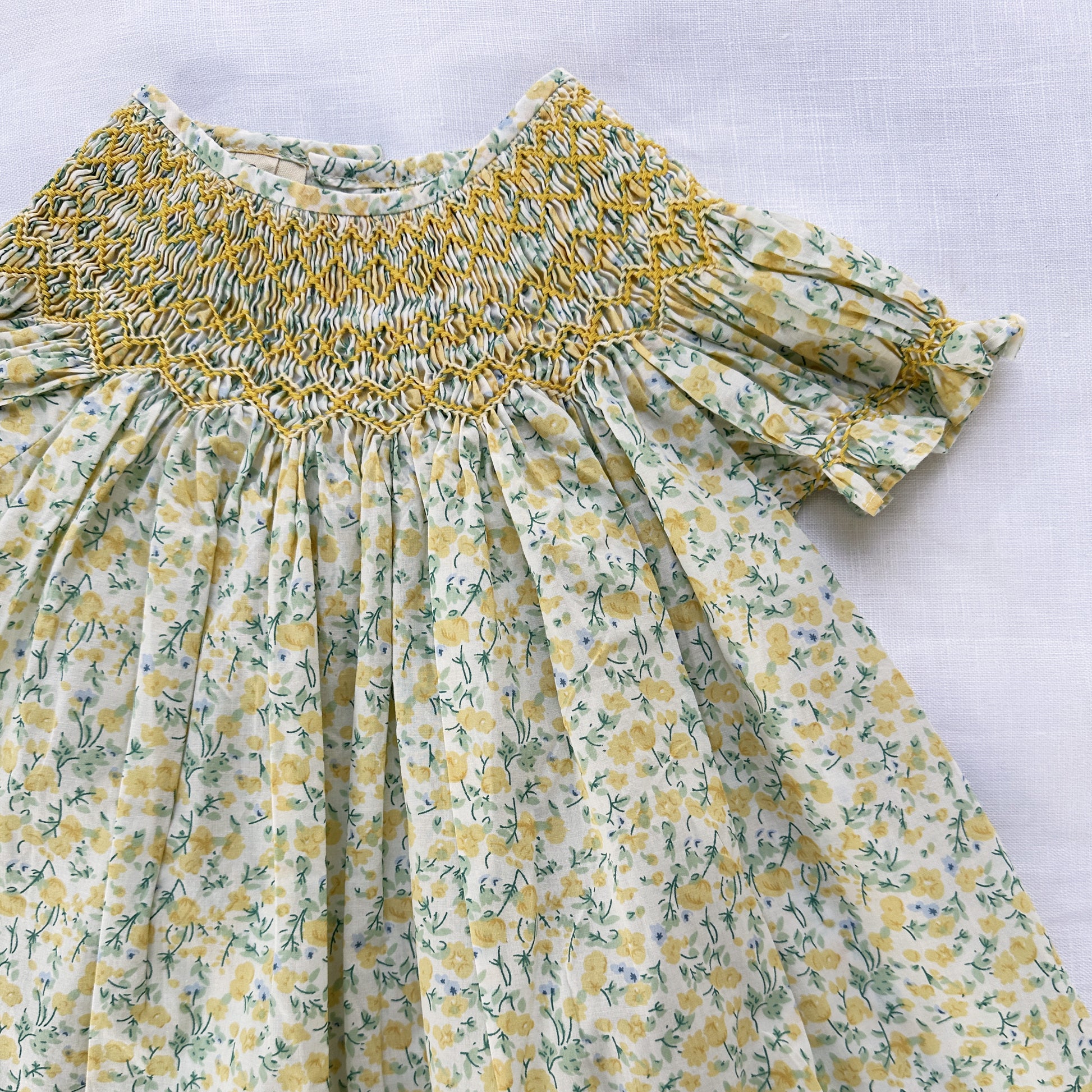 This cheerful short-sleeved dress is made from 100% soft cotton, featuring a delicate print of tiny flowers on a warm yellow background. With its classic smocked detail and airy comfort, it’s perfect for bright everyday moments and special sunny-day occasions.
