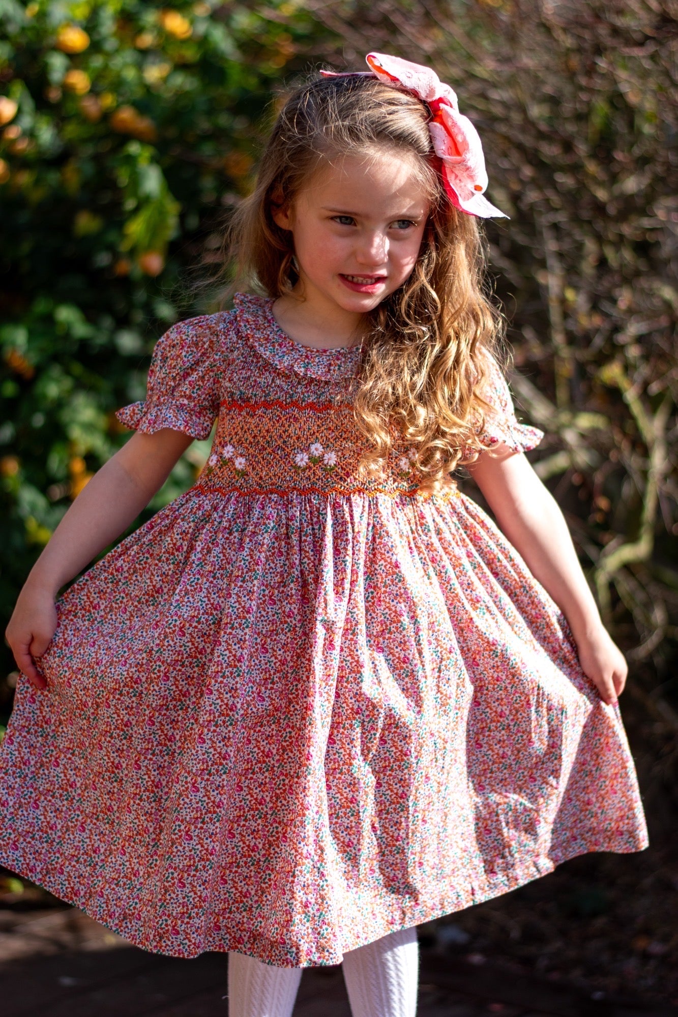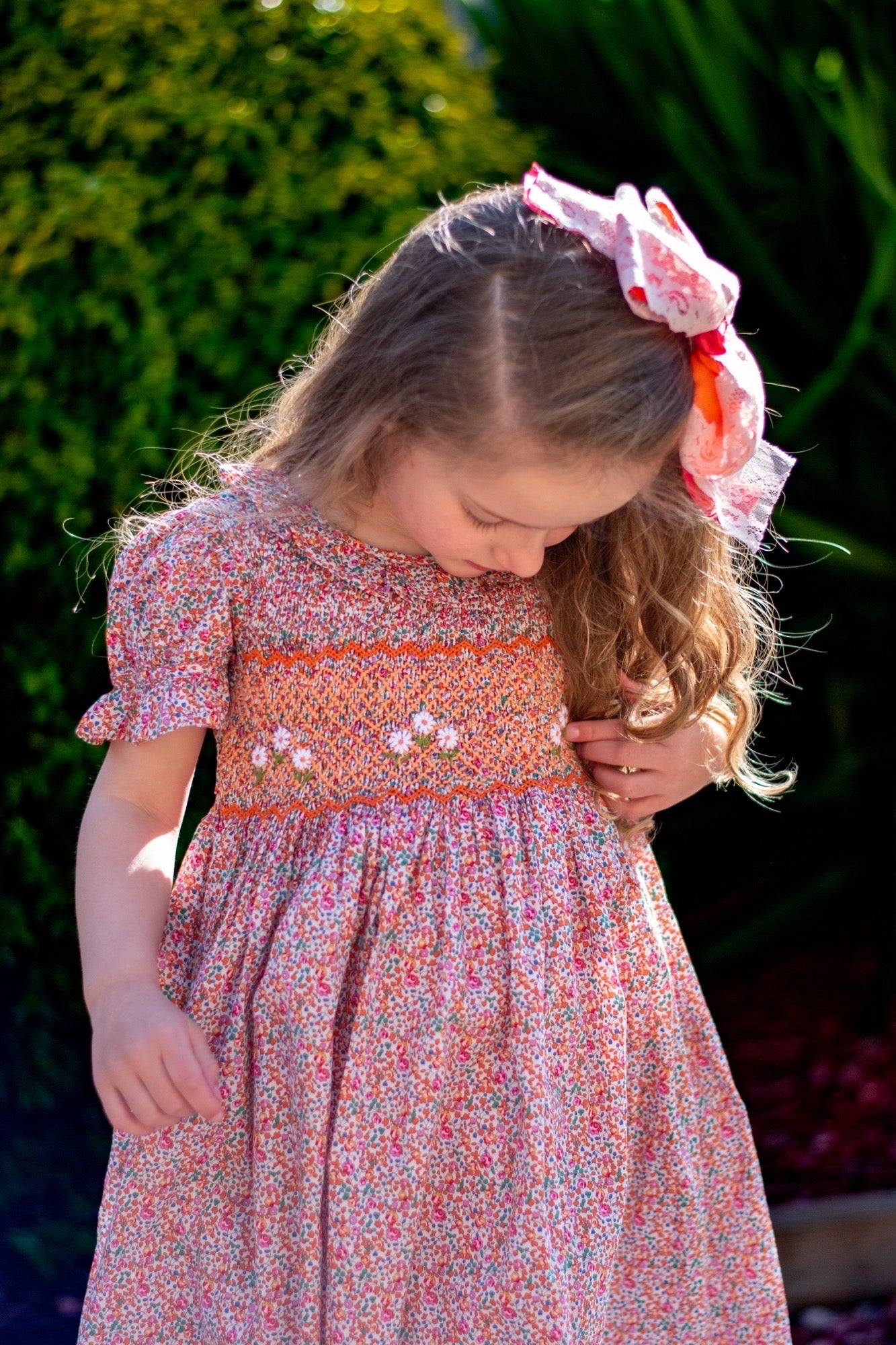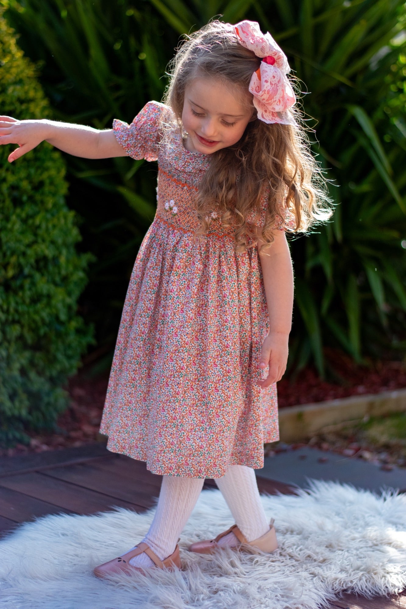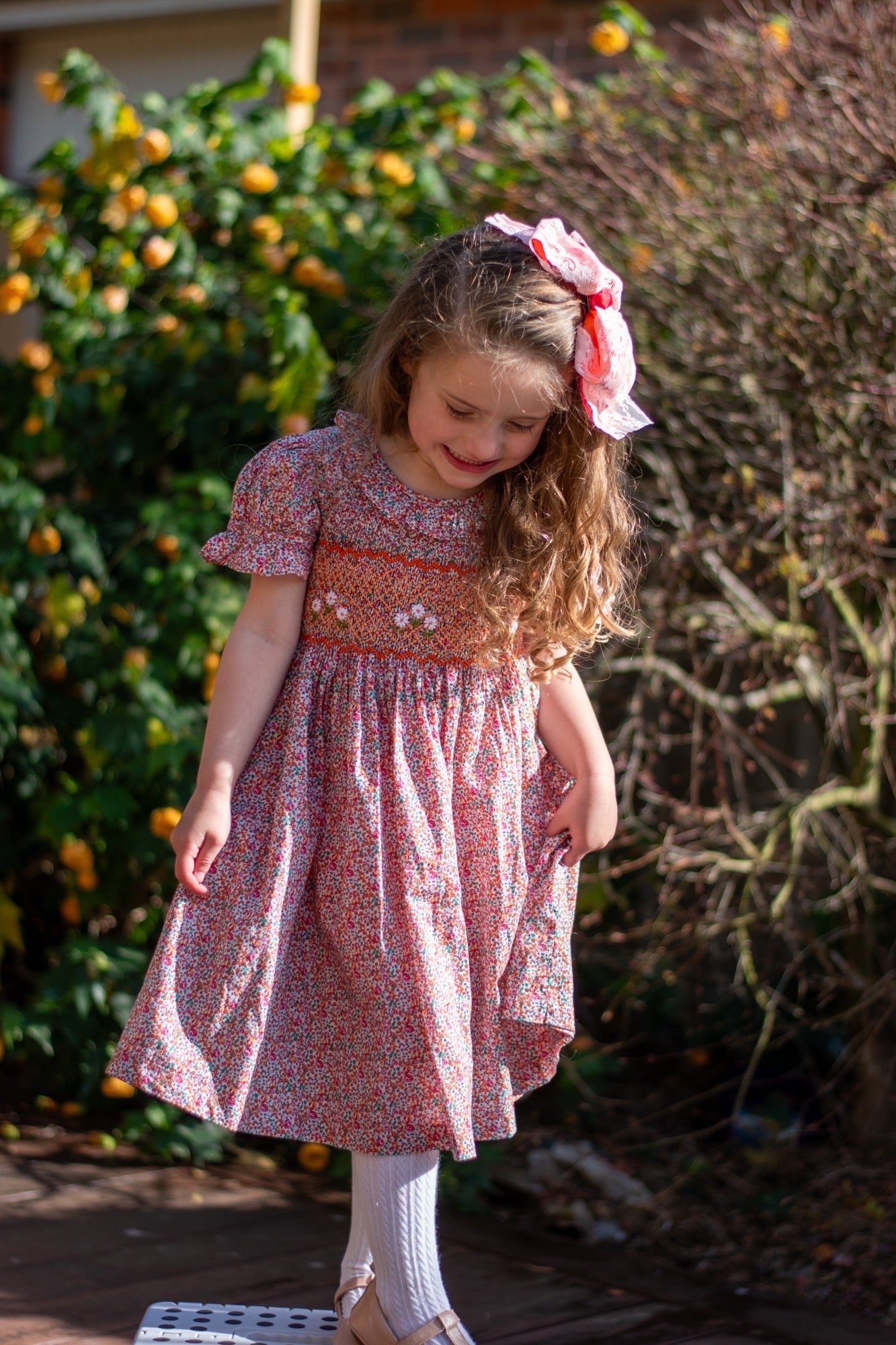 This is simply a gorgeous dress! It is made of cotton, short sleeves, with very detail hand smock and embroidery.
