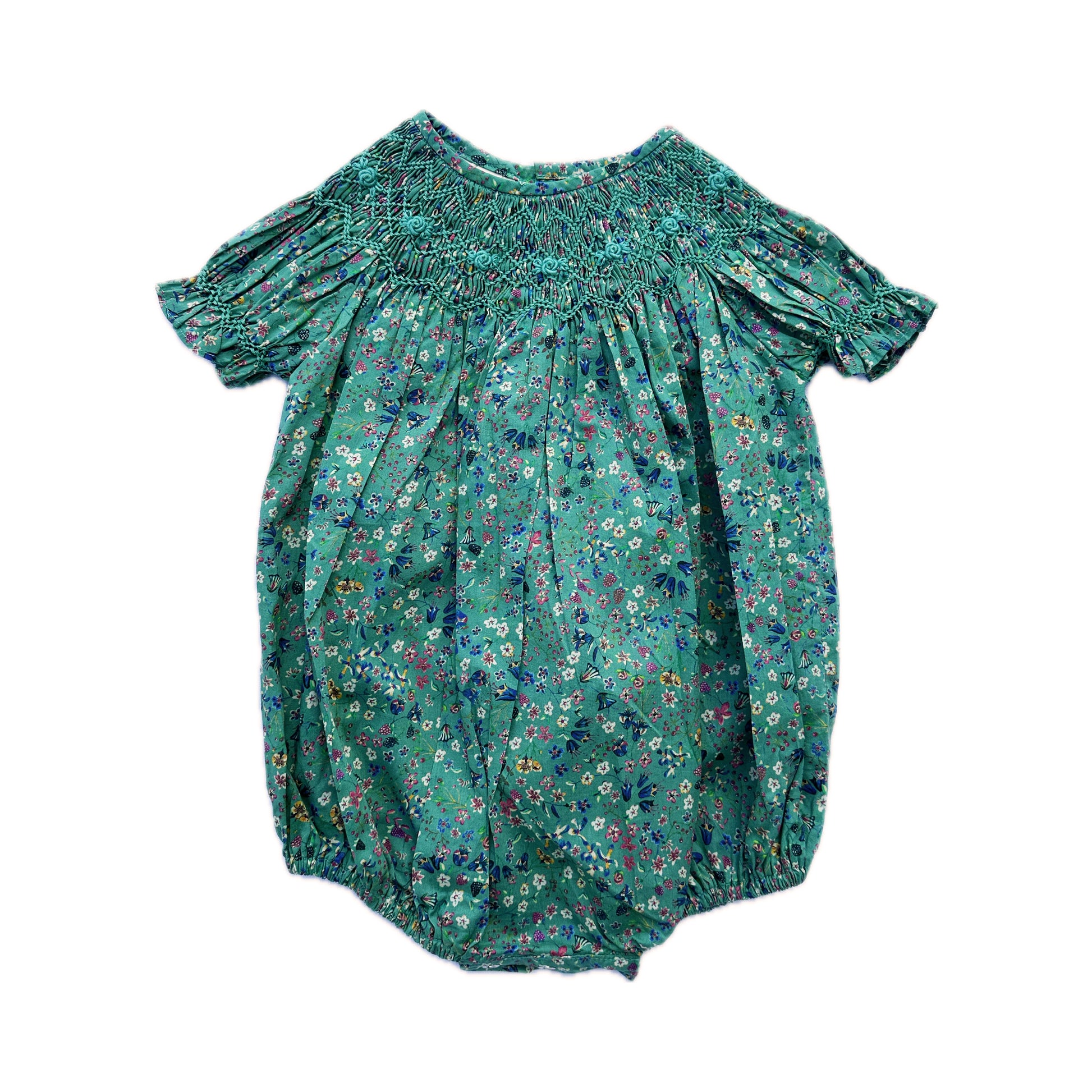 Designed with short sleeves and classic smocking across the neck, it’s light, comfortable, and easy for everyday play. Simple yet timeless, this romper is perfect for outings or casual occasions.