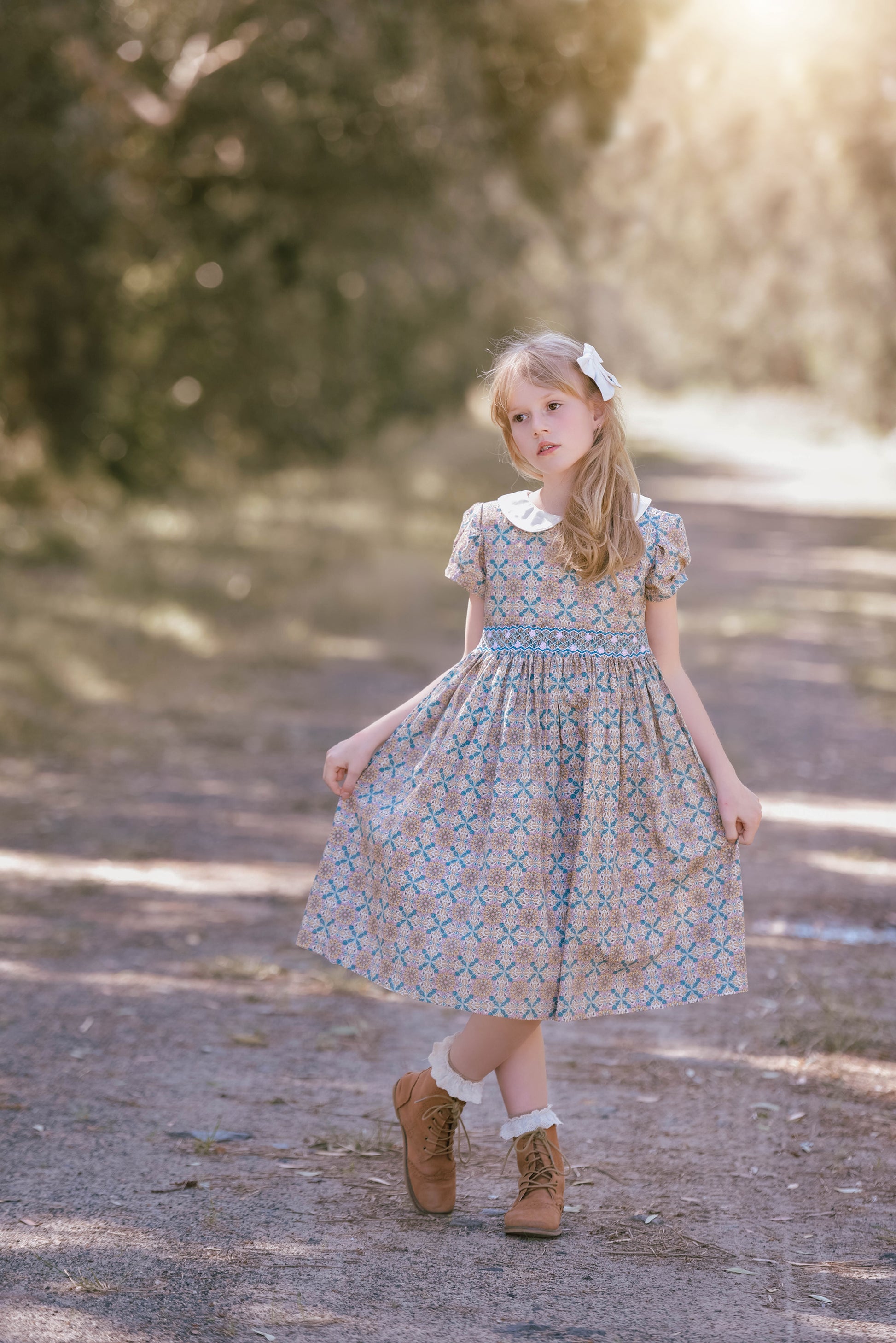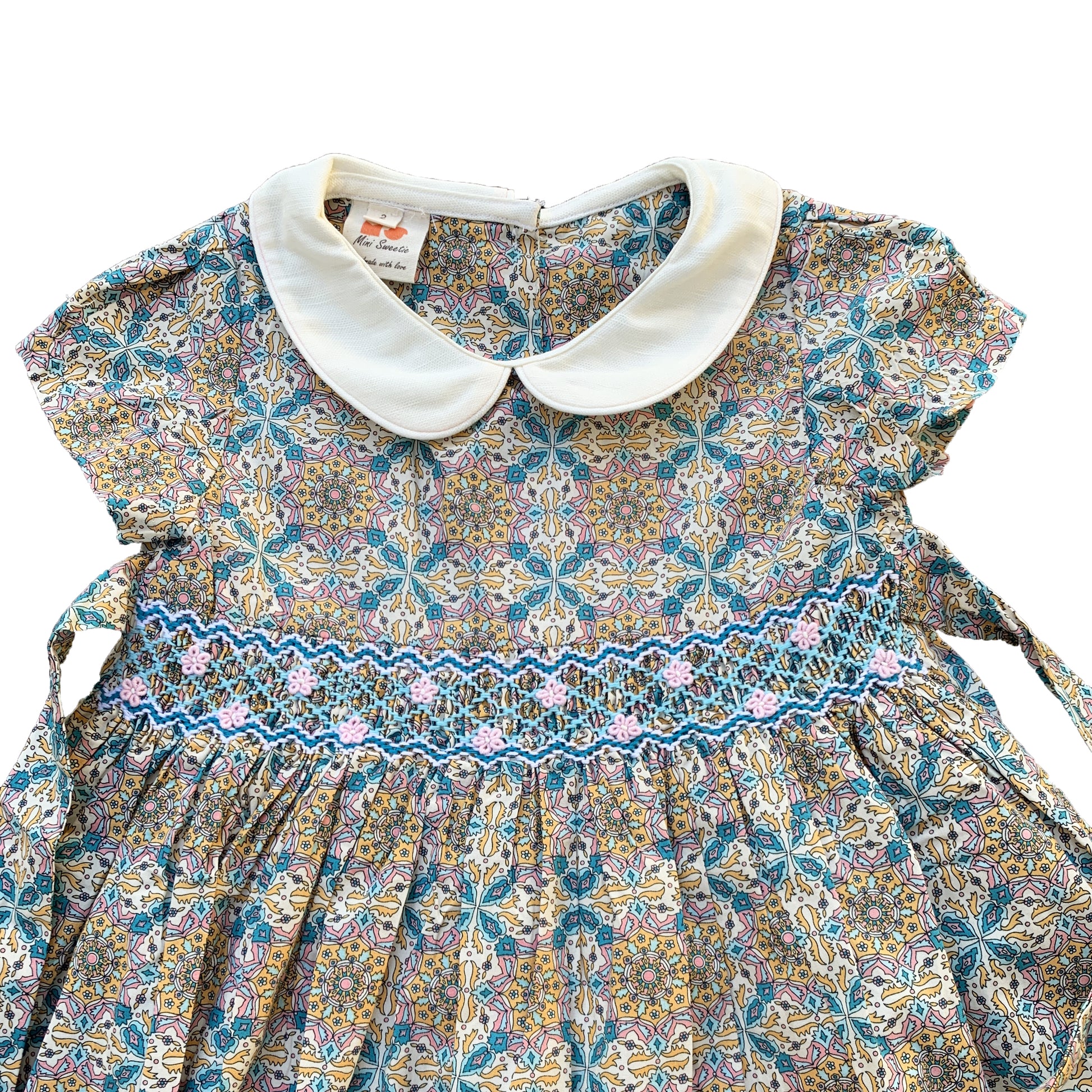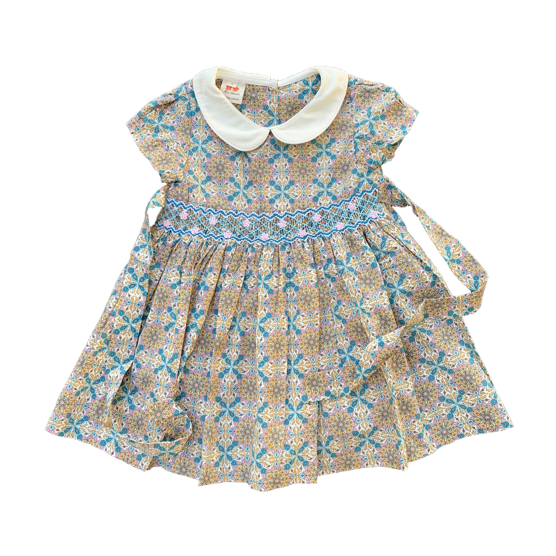 Just a beautiful classic smocked dress made of vintage pattern fabric. It has peter pan collar and hand smocking around the chess. Very comfortable, suitable for everyday wear as well as formal occasions.